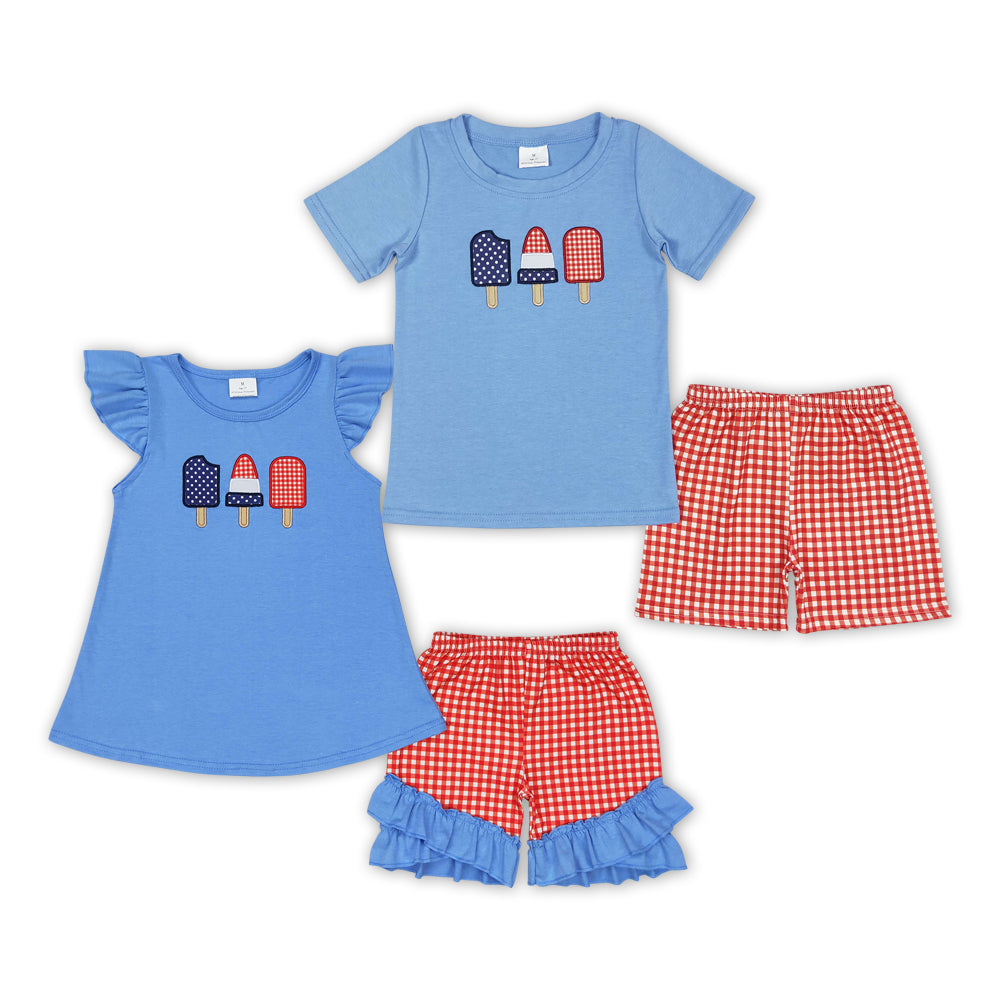 Popsicle Embroidery Blue Top Red Plaid Shorts Sibling 4th of July Matching Clothes