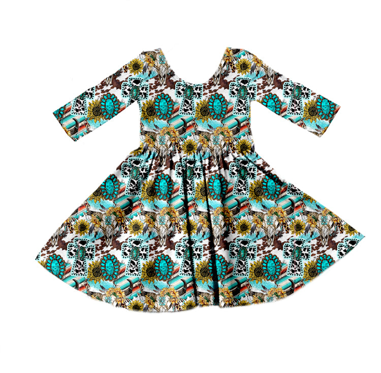 (Pre-order) GLD0395 Turquoise sunflowers print Girls Knee Length Dress