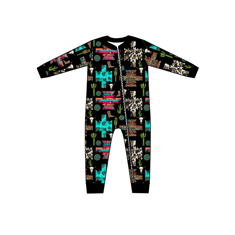 (Pre-order) LR0612 Black turquoise print baby boys zipper western romper
