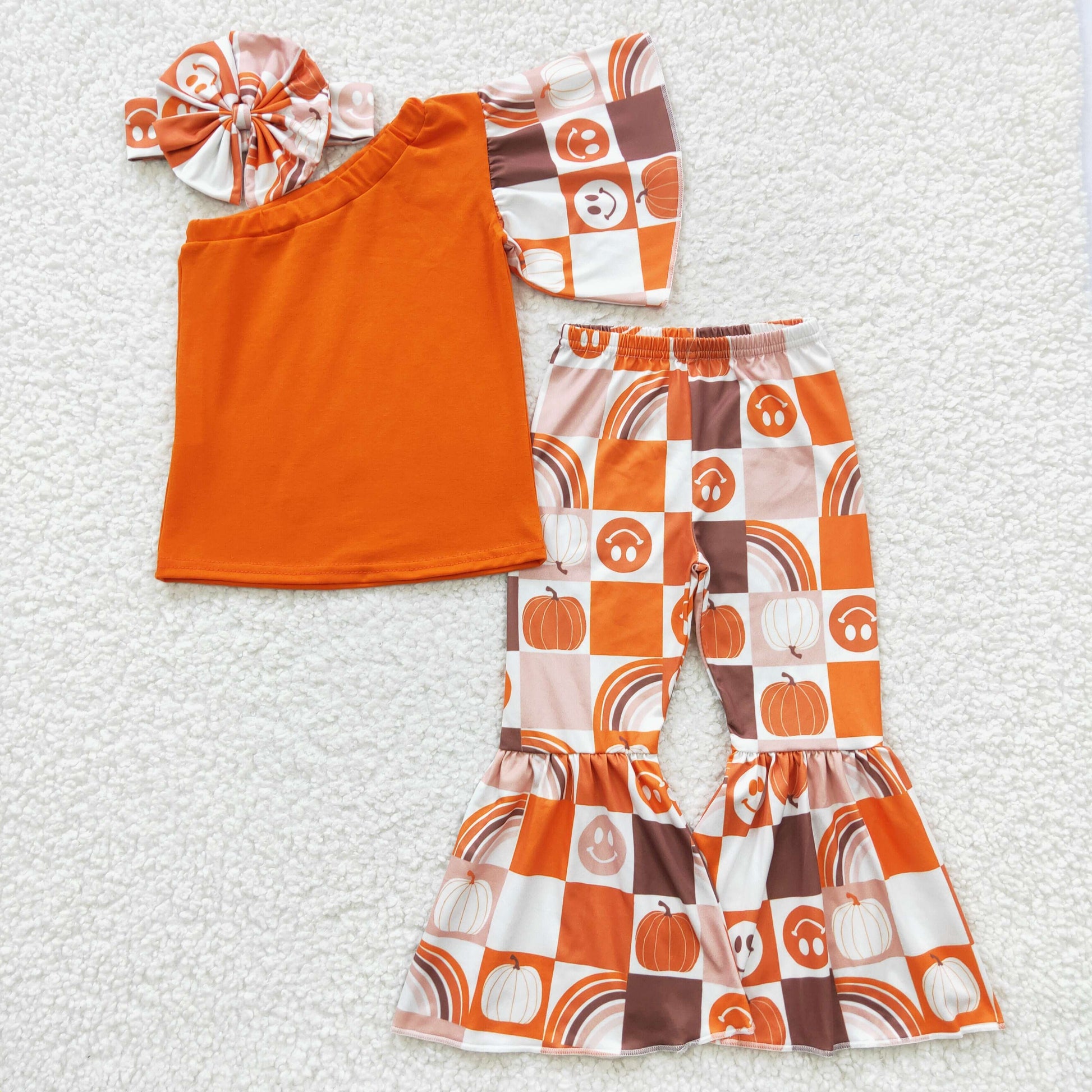 GSPO0620 Orange one shoulder top plaid punpkin bell pants 3 pieces outfits
