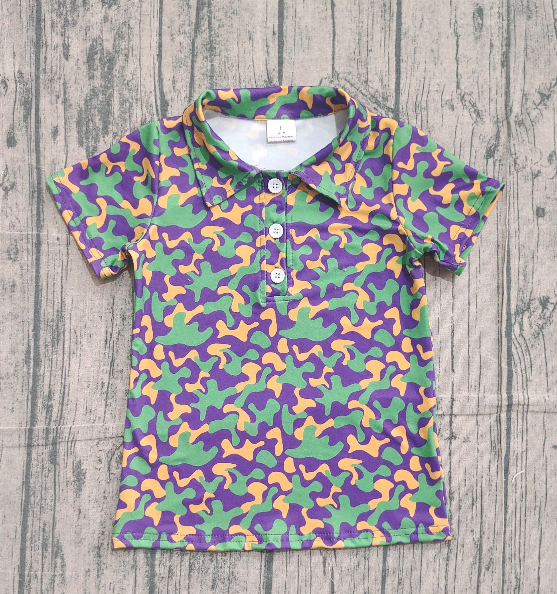 (Pre-order)BT1498 Green Purple Camo Print Boys Mardi Gras Polo Top