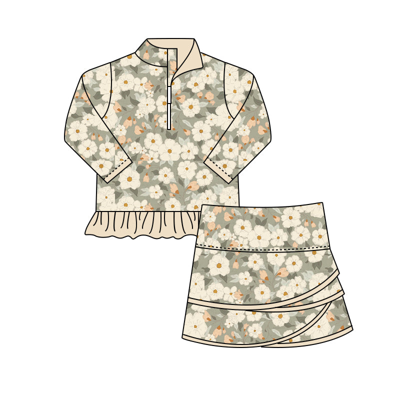 (Pre-order)GLD1008 Grey Flowers Long Sleeve Zip Top Skirts Girls Clothes Set