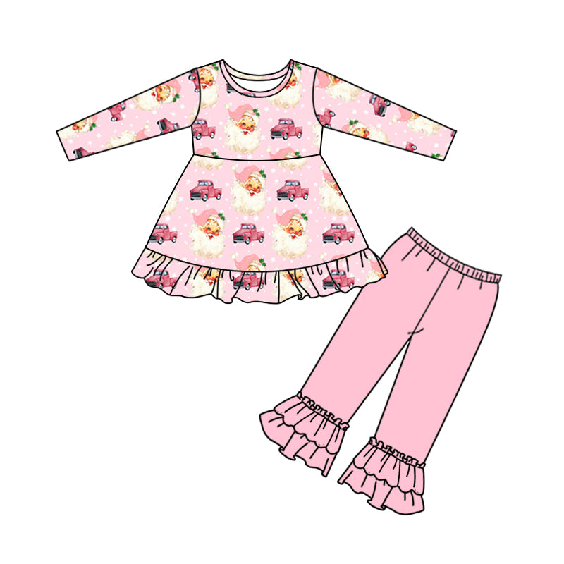 (Pre-order)GLP0734 Pink Santa print tunic top ruffle pants girls Christmas clothes set