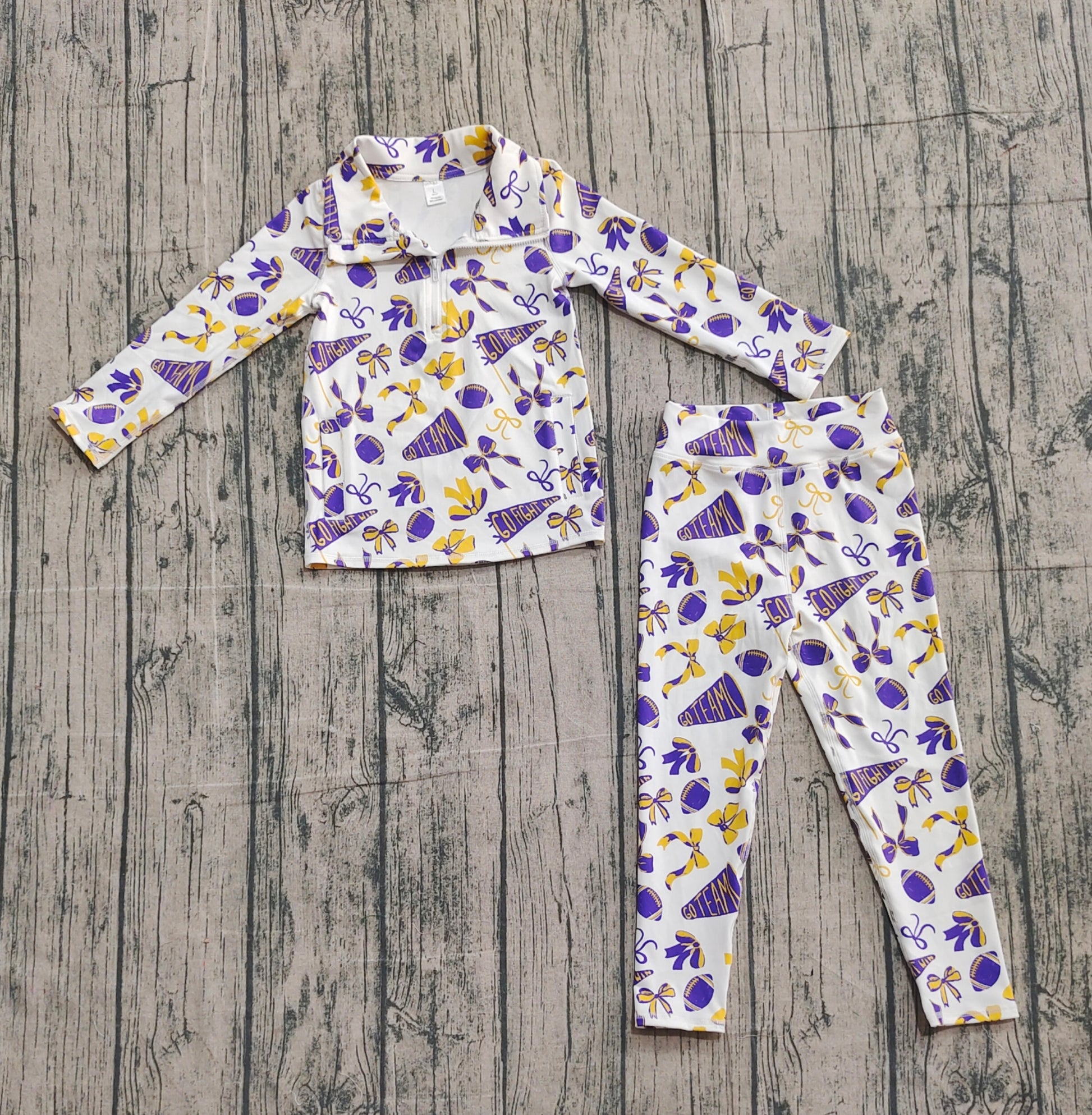 (Pre-order)GLP2762 Purple Bows Cheer Zipper Pullover Top Pants Girls Yoga Clothes Set