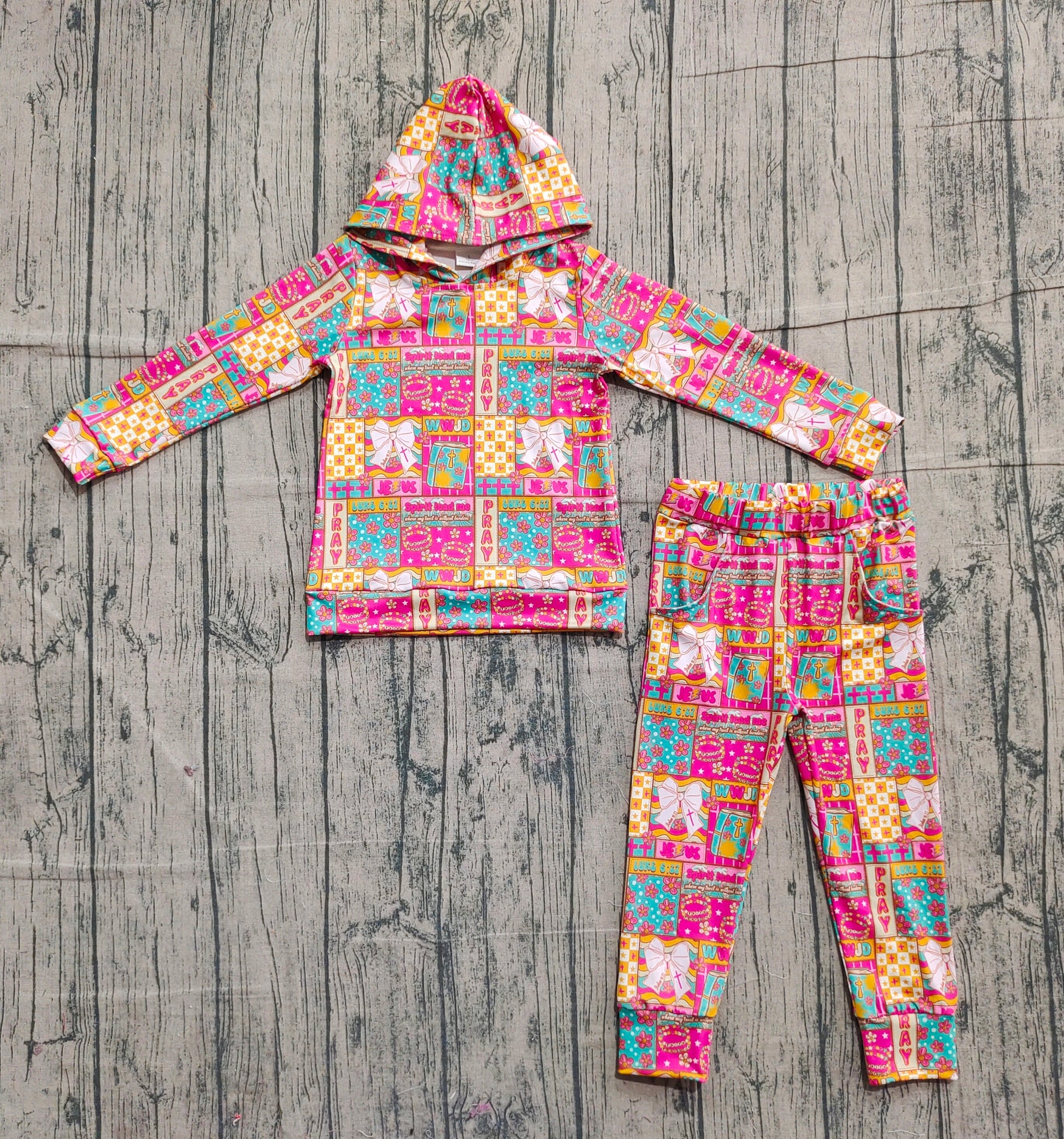 (Pre-order)GLP2891 Flowers Bows Cross Jesus Hoodie Top Pockets Pants Girls Easter Clothes Set