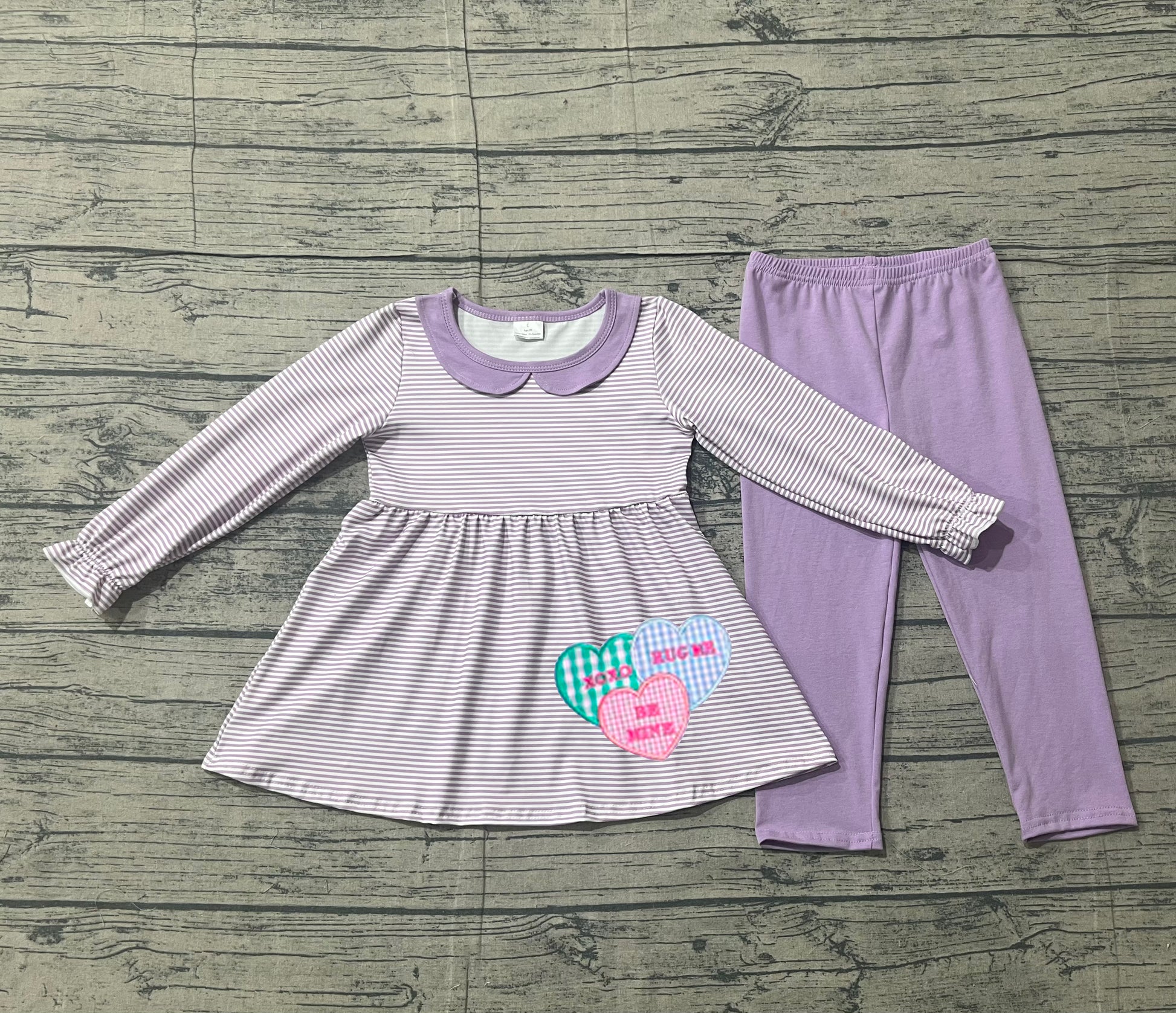 (Pre-order)GLP3262 XOXO Hearts Stripes Tunic Top Purple Pants Girls Valentine's Day Clothes Set