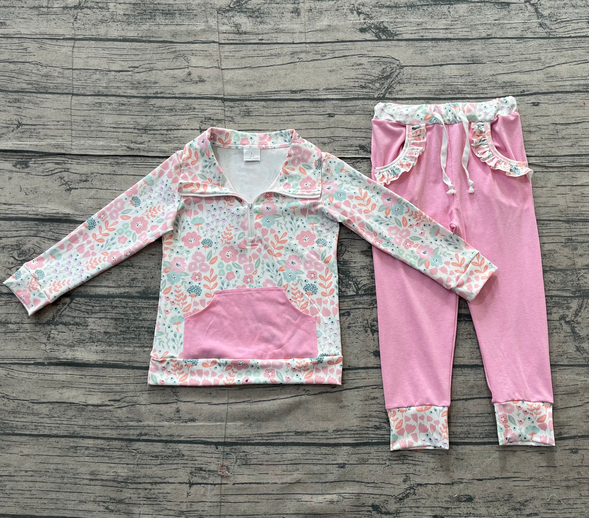 (Pre-order)GLP3279 Pink Flowers Zipper Top Pockets Pink Pants Girls Clothes Set