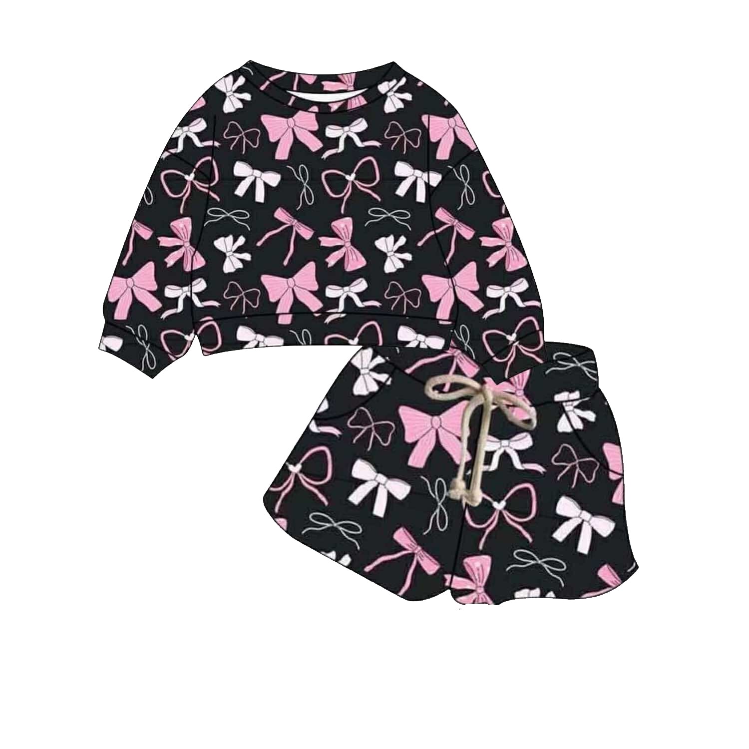 (Pre-order)GLS0015 Pink Bows Print Long Sleeve Top Shorts Girls Clothes Set