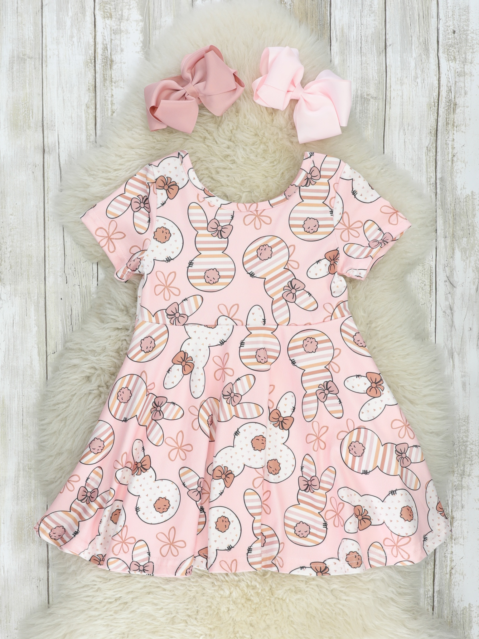 (Pre-order)GSD0570 Pink Bunny Flowers Print Girls Knee Length Easter Dress