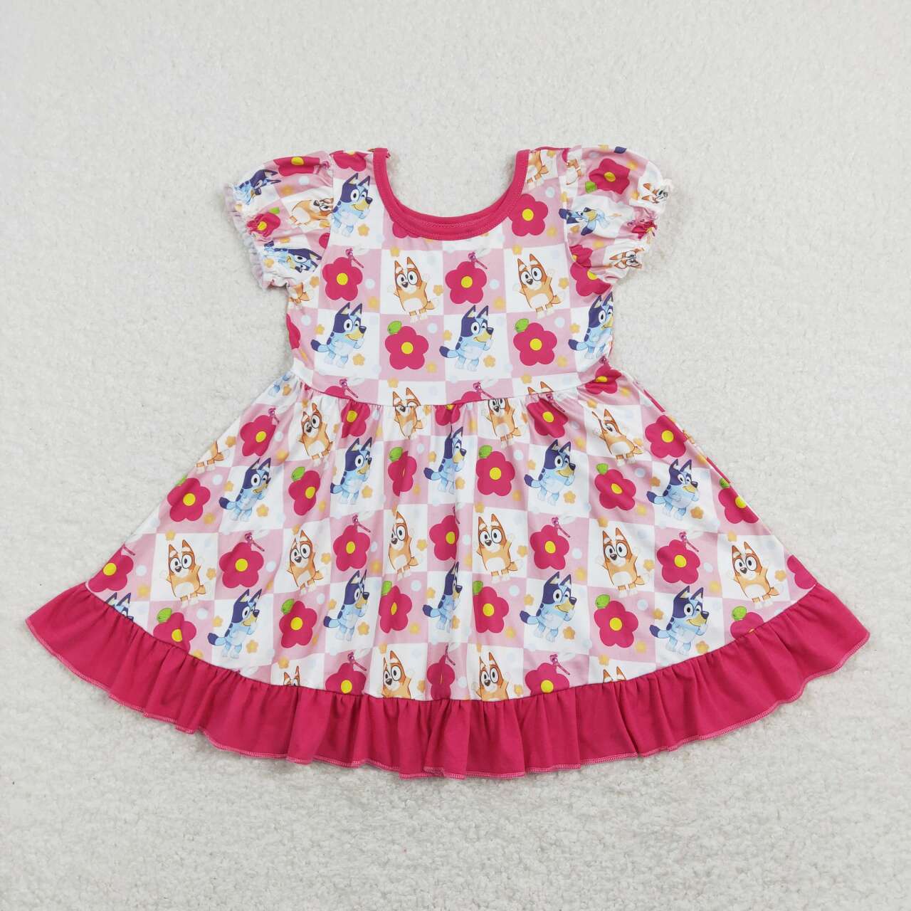 GSD0740 Cartoon Dog Flowers Print Girls Summer Knee Length Dress
