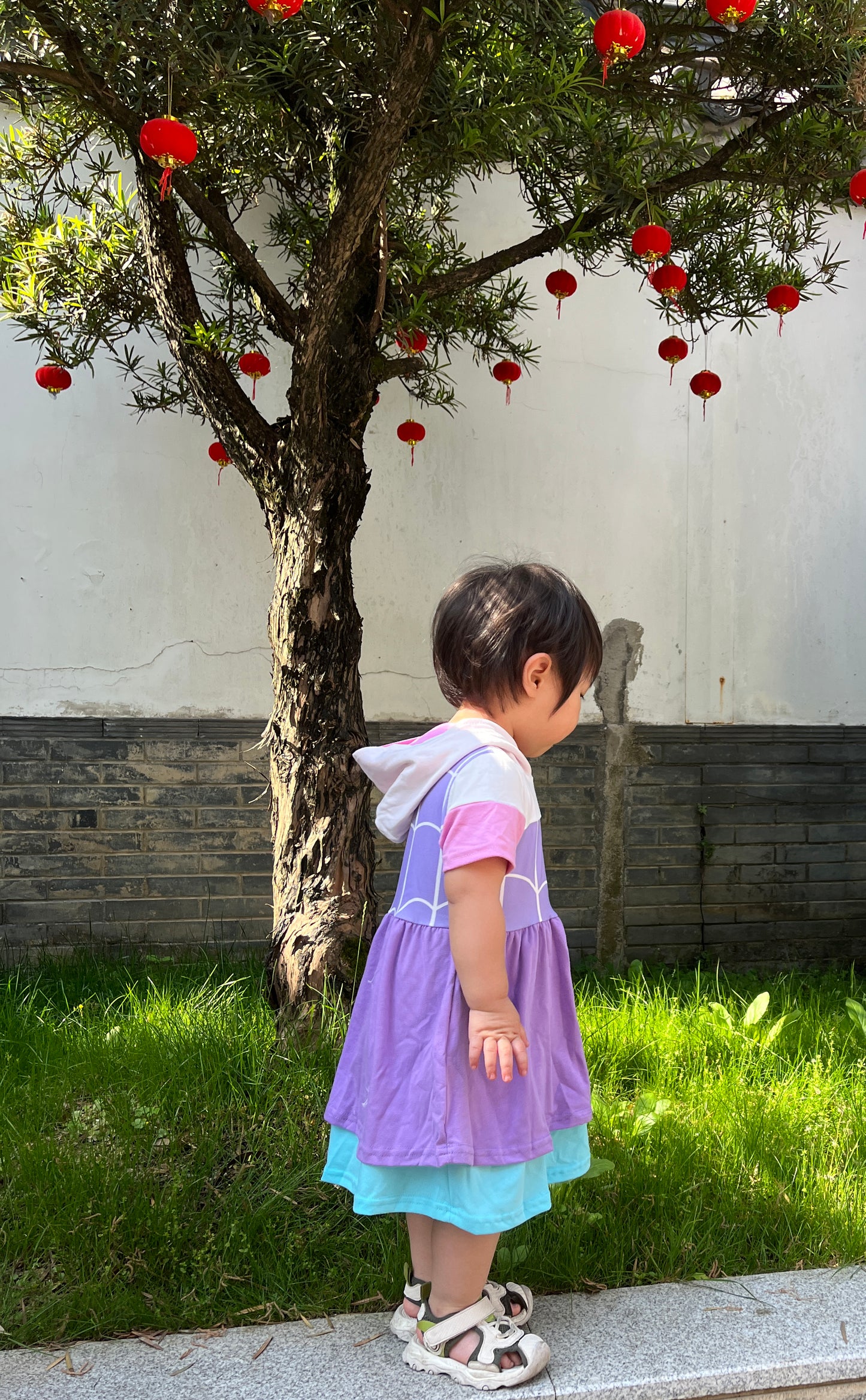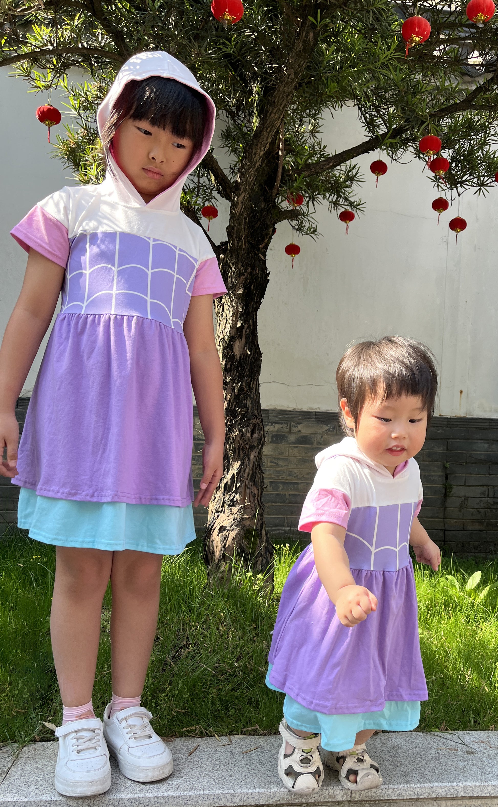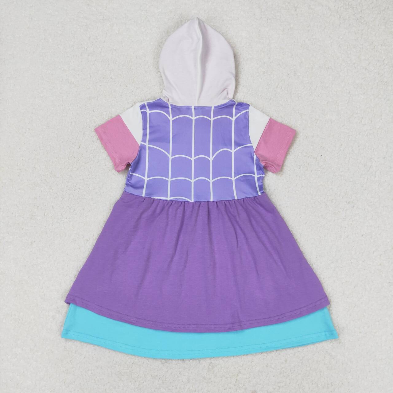 GSD0996 Purple Cartoon Spider Print Girls Knee Length Summer Hoodie Dress