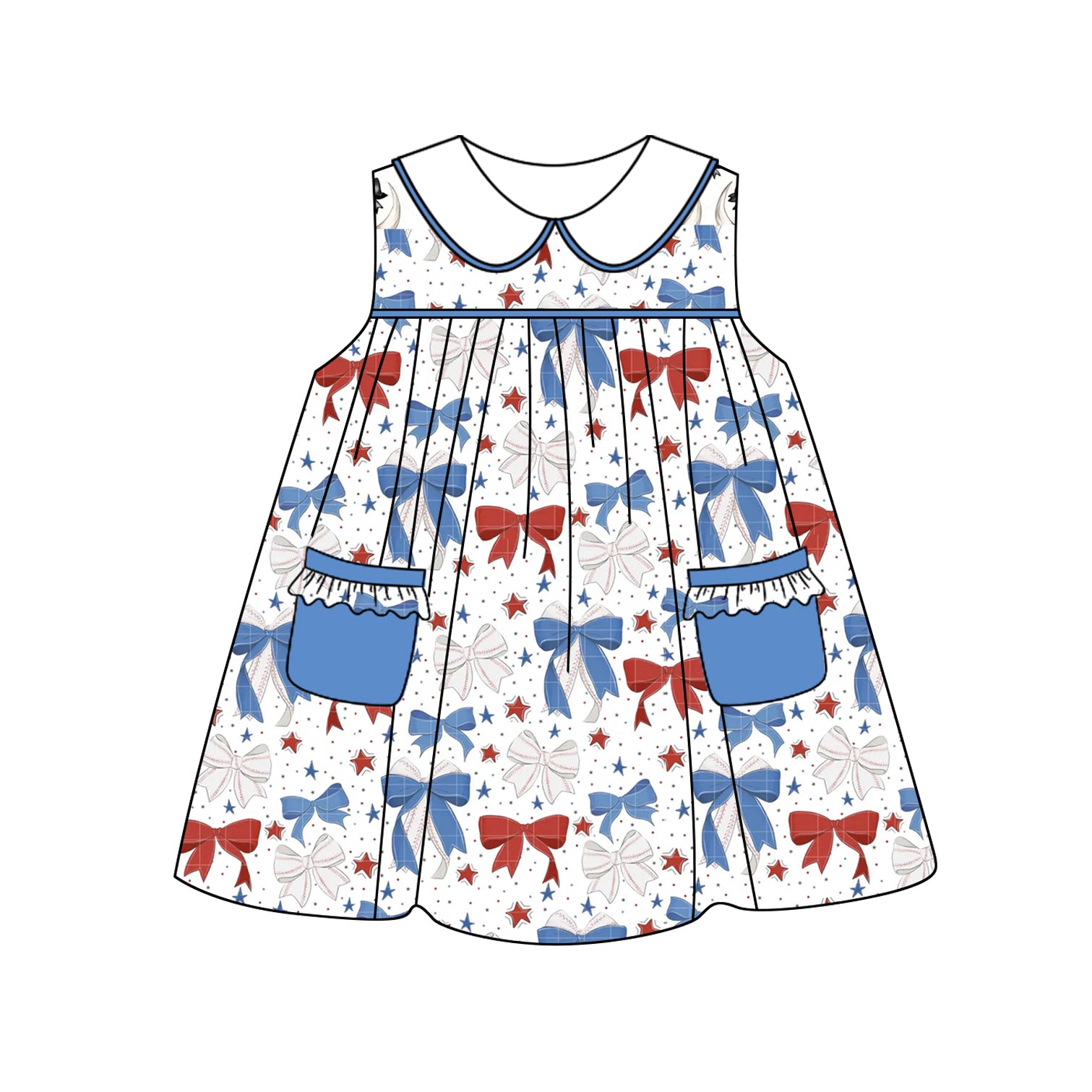 (Pre-order)GSD2148 Red Blue Stars Bows Print Girls 4th of July Knee Length Dress