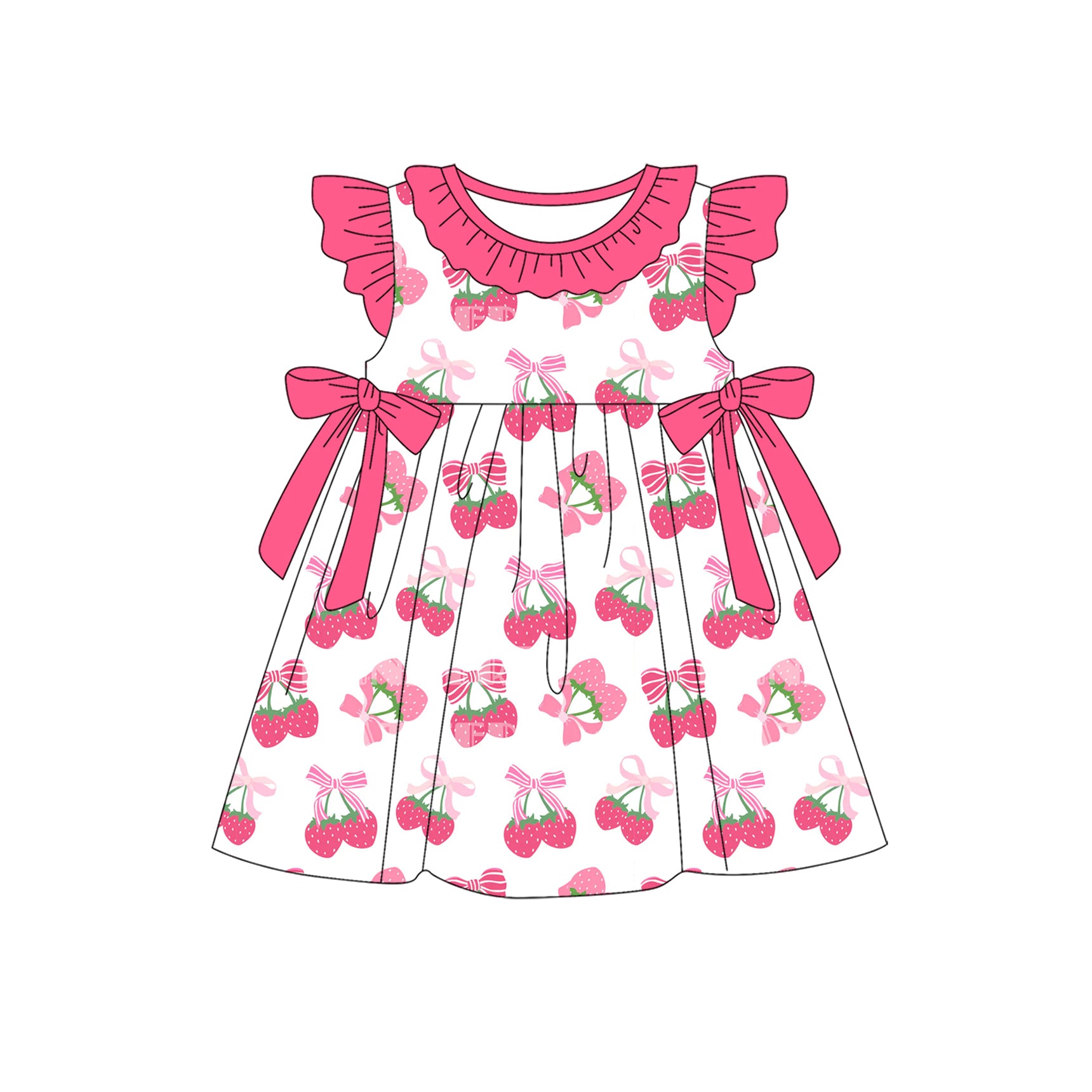 (Pre-order)GSD2455 Strawberry Pink Bows Print Girls Summer Knee Length Dress