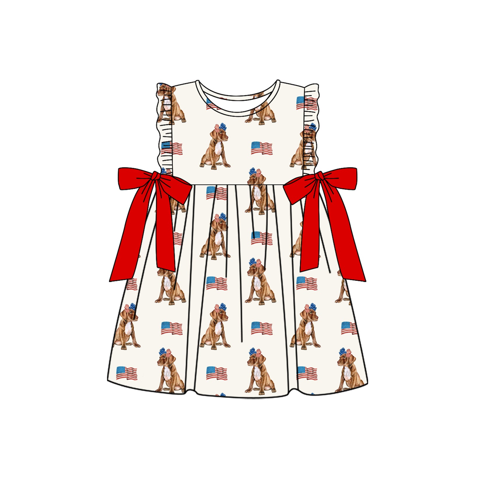 (Pre-order)GSD2466 Dog Flag Print Girls 4th of July Knee Length Dress