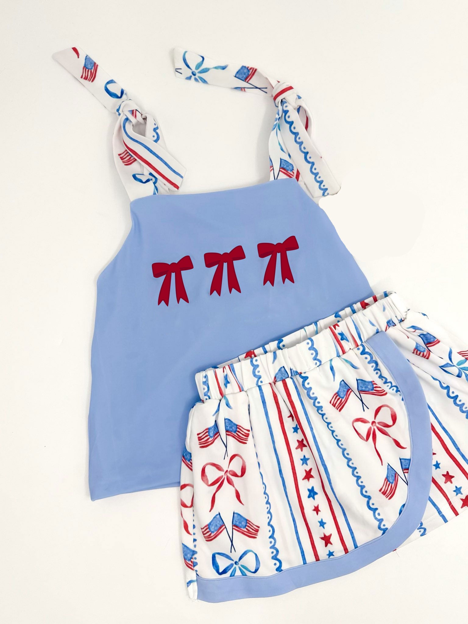 (Pre-order)GSD3025 Bows Strap Top Stars Flags Skirts Girls 4th of July Clothes Set