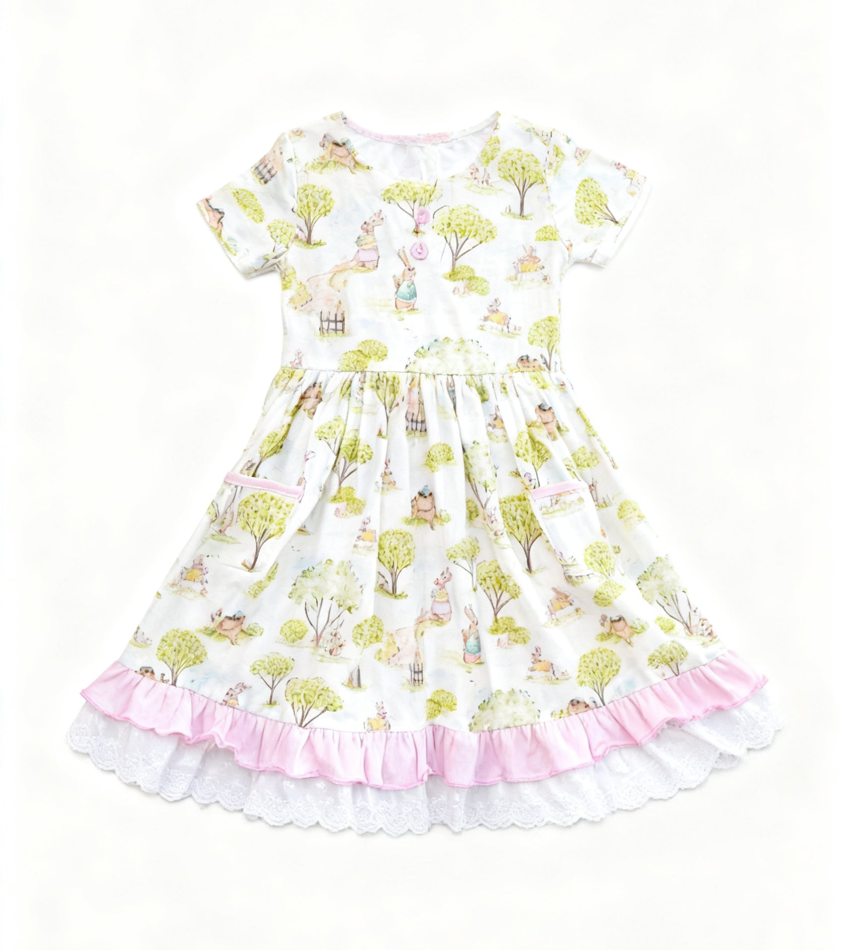 (Pre-order)GSD3364 Bunny Tree Print Girls Easter Knee Length Dress
