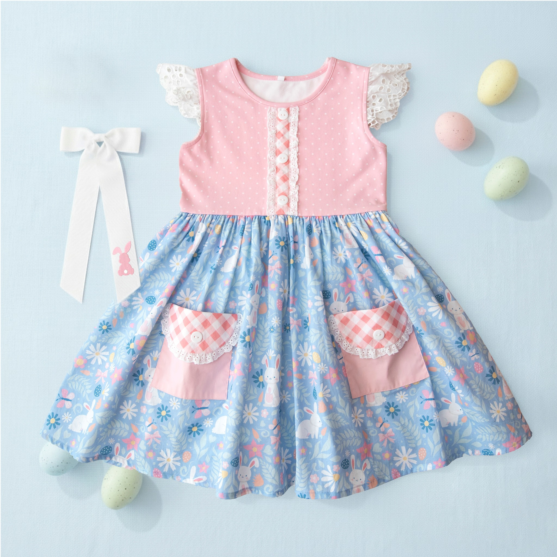 (Pre-order)GSD3412 Bunny Flowers Print Pockets Girls Easter Knee Length Dress