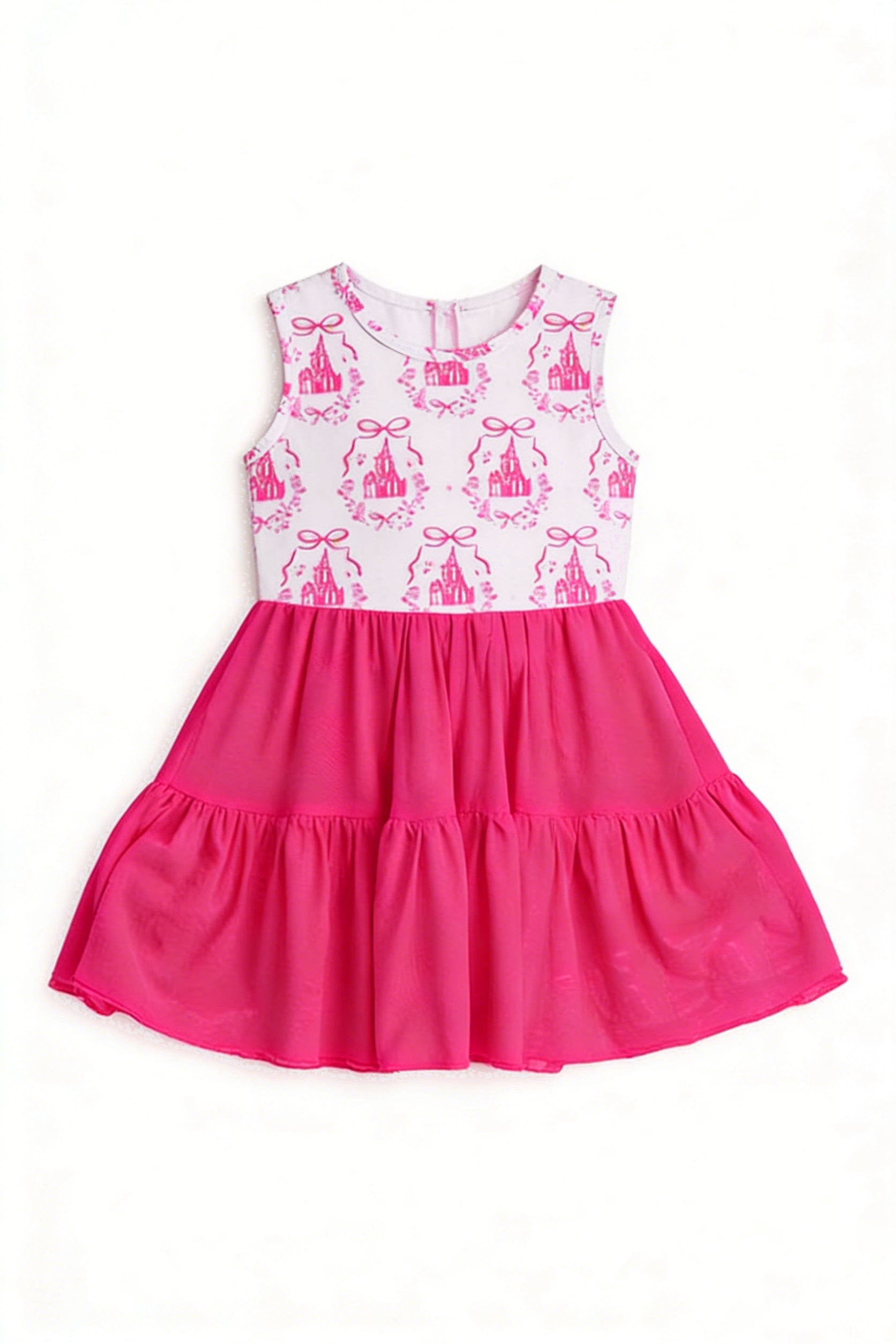 (Pre-order)GSD3461 Castle Bows Hot Pink Print Girls Summer Knee Length Yoga Dress