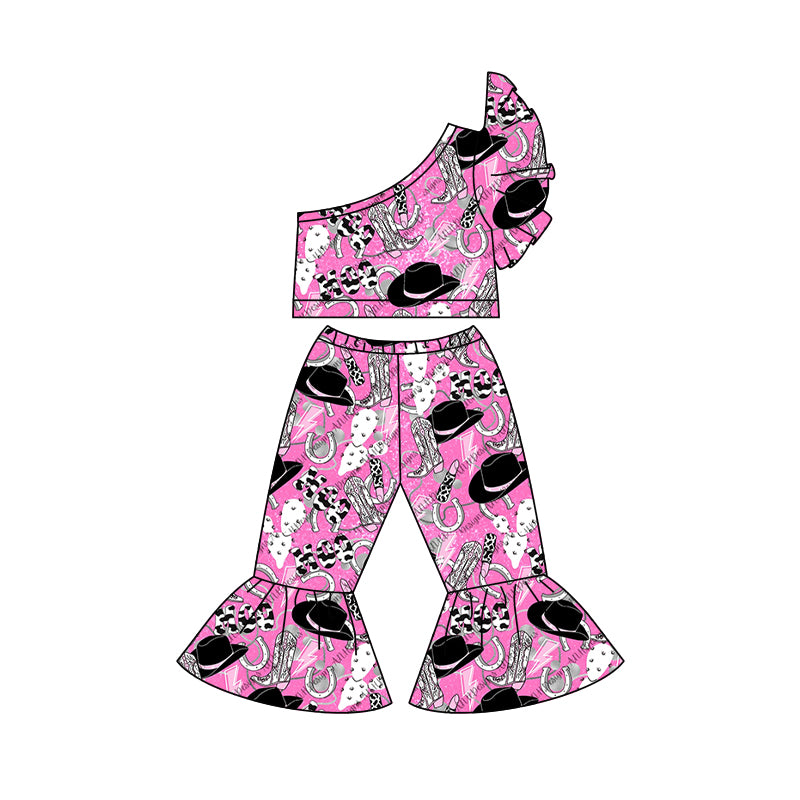 (Pre-order)GSPO1267 One Shoulder Top Hat Boots Cactus Pink Print Girls Clothes Set