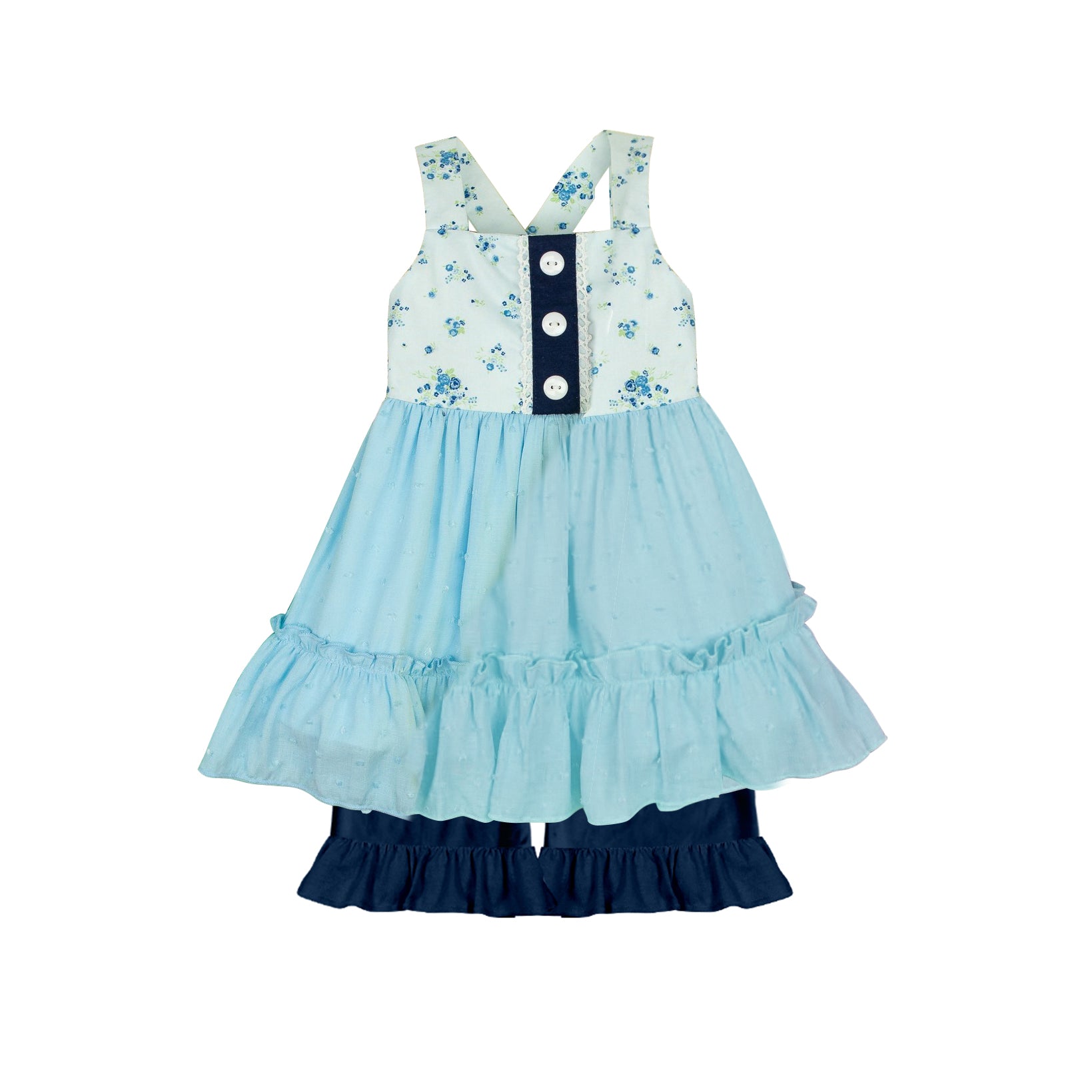 (Pre-order)GSSO1487 Blue Flowers Top Navy Shorts Girls Summer Clothes Set