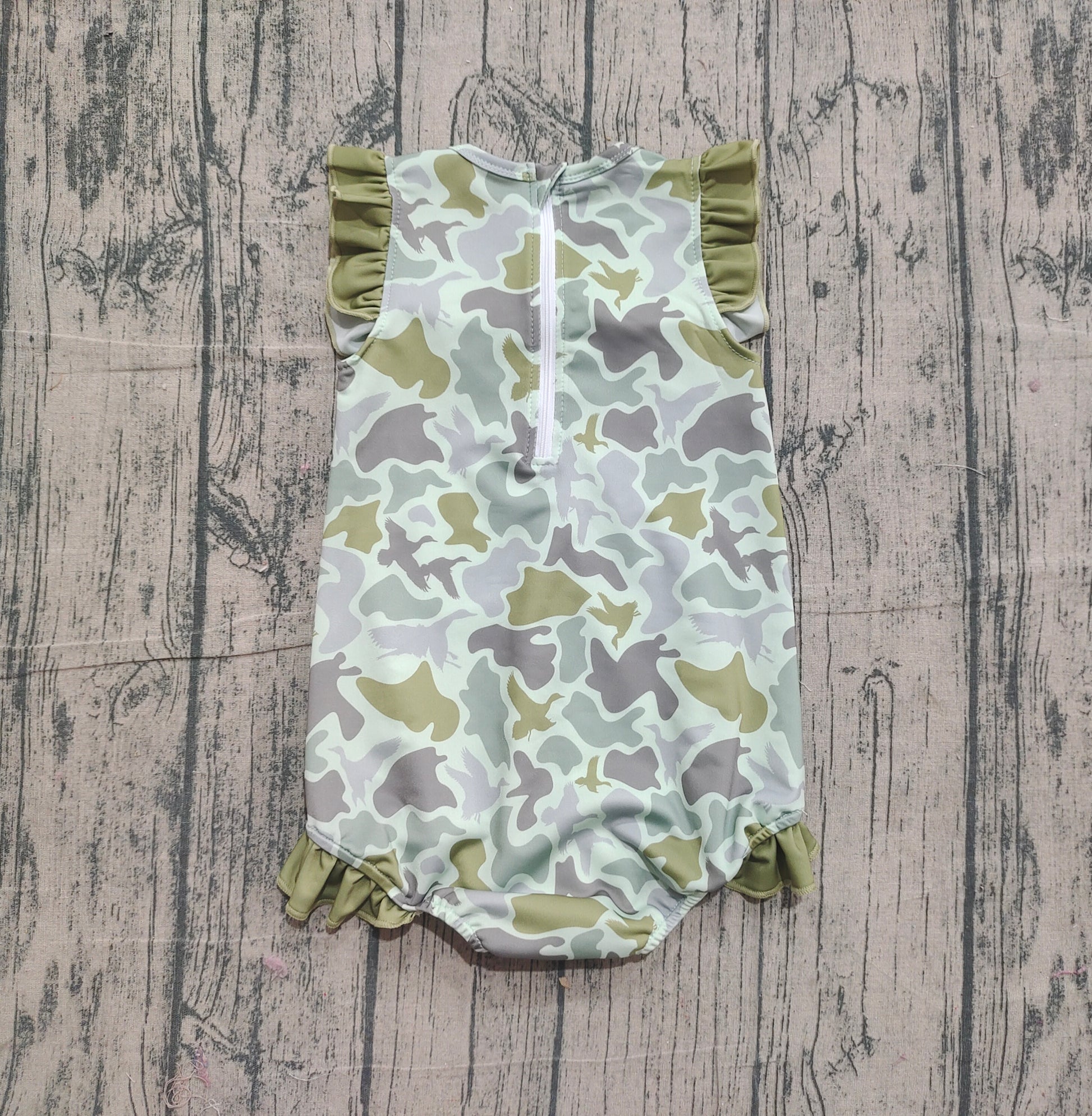 (Pre-order)S0596 Duck Green Camo Print Girls Summer Ruffle 1 Piece Swimsuits