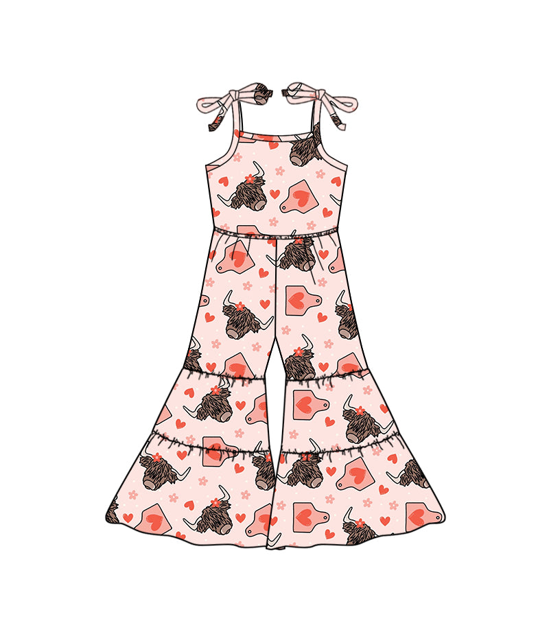 (Pre-order)SR0718 Highland Cow Tag Heart Print Girls Valentine's Straps Jumpsuit