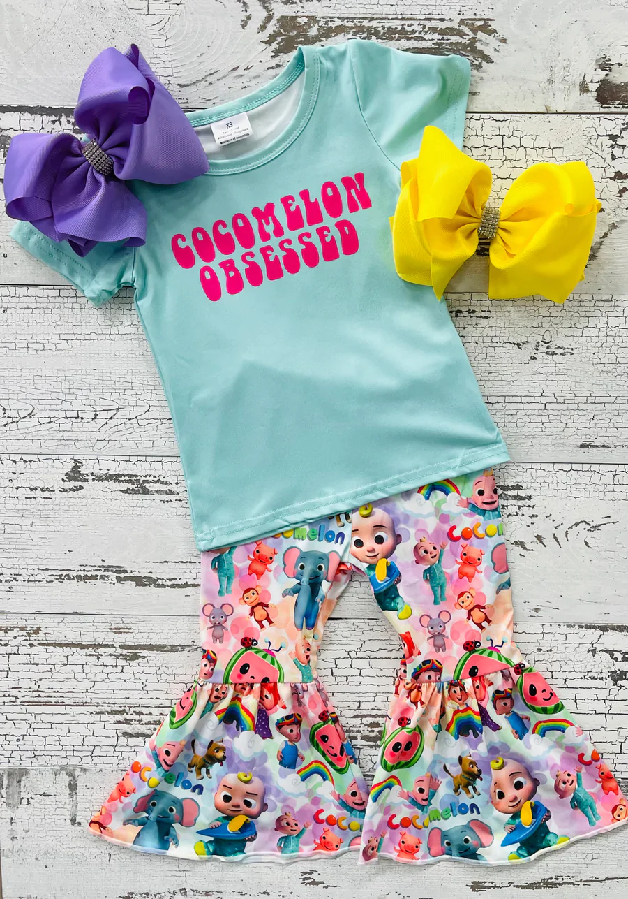 (Promotion) Short sleeve cartoon print bell bottom pants outfits E6-4