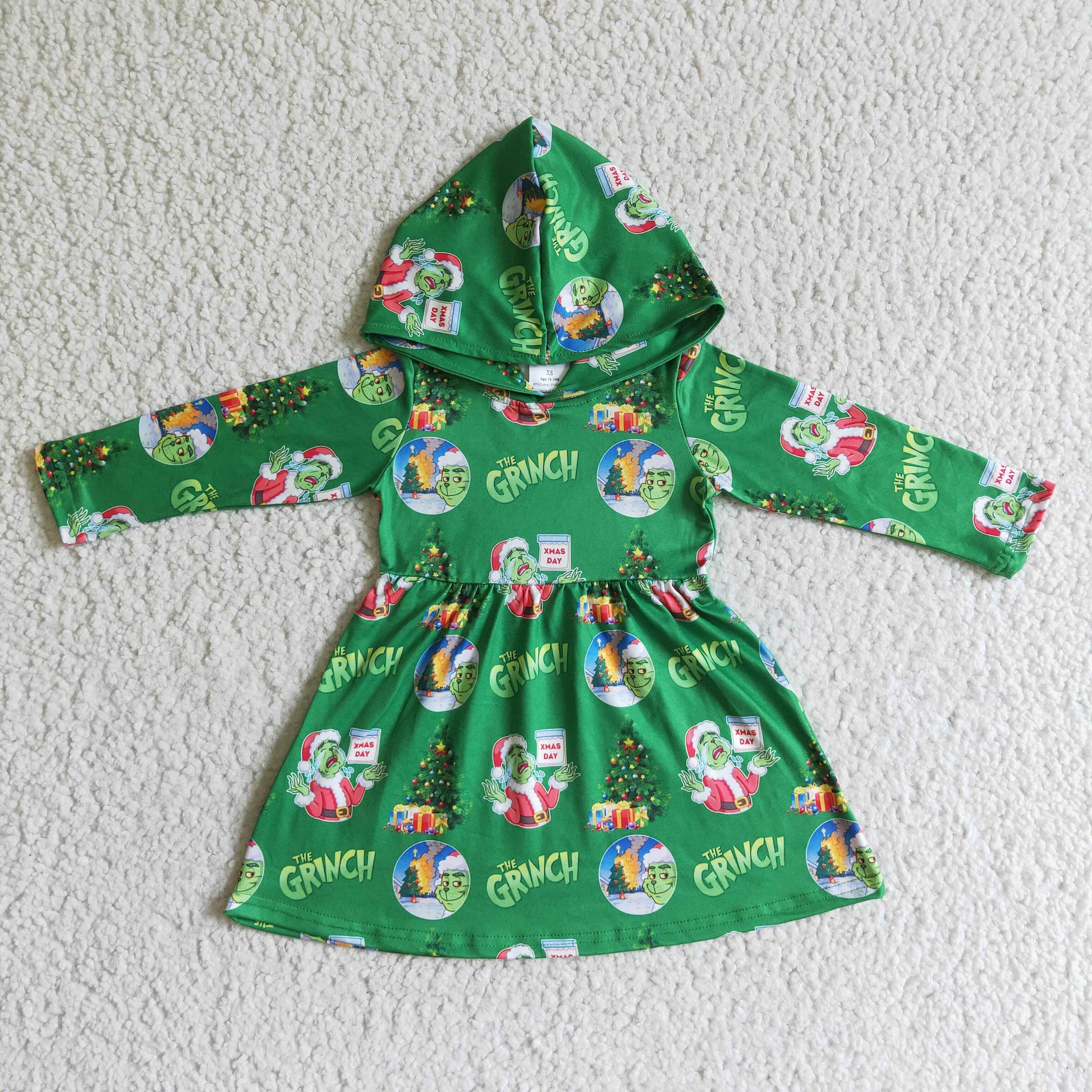 (Promotion)6 B10-24 Christmas Green Frog Girls Hooded Knee Length Dress