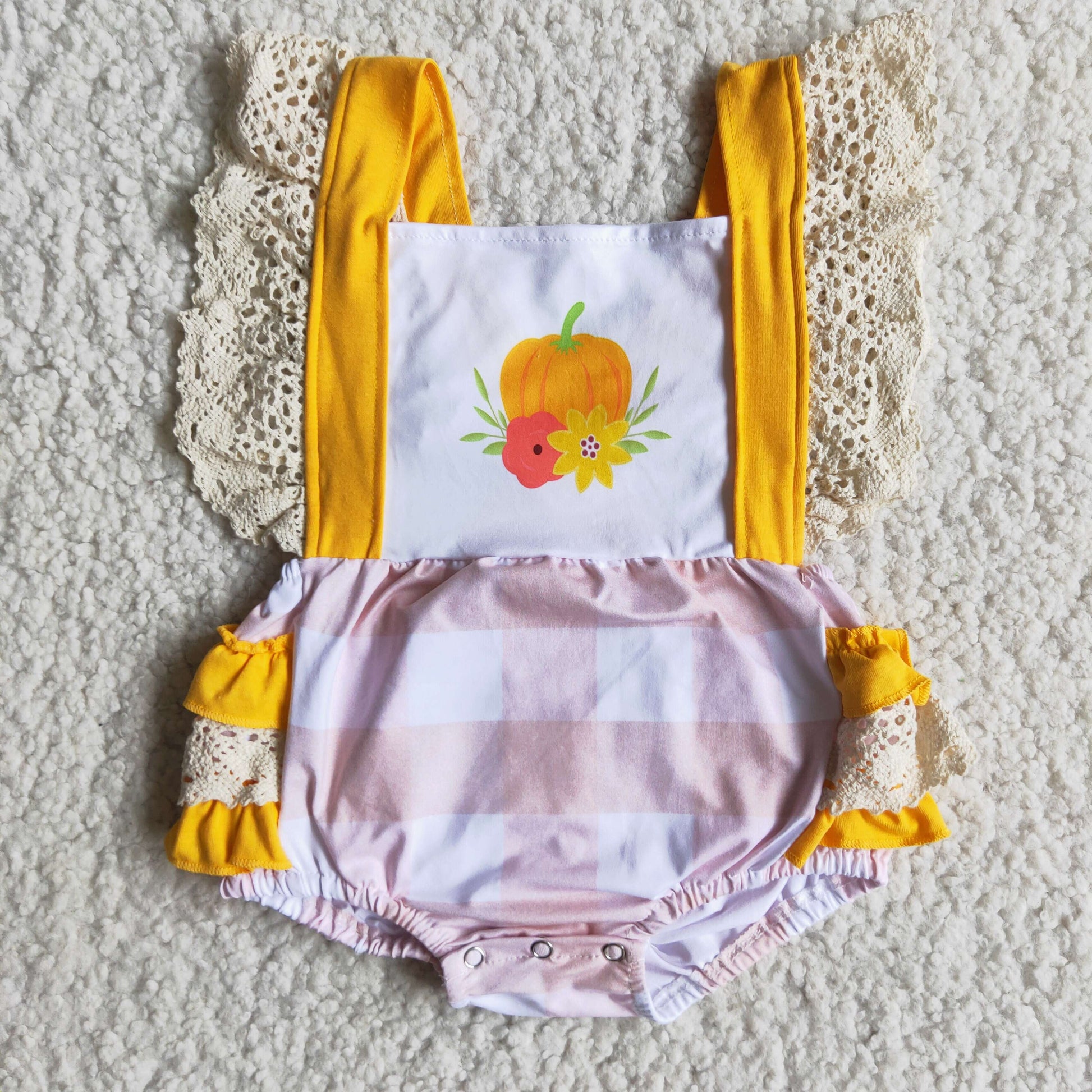 (Promotion)A0-13 Pumpkin Flowers Plaid Baby Girls Fall Bubble Romper