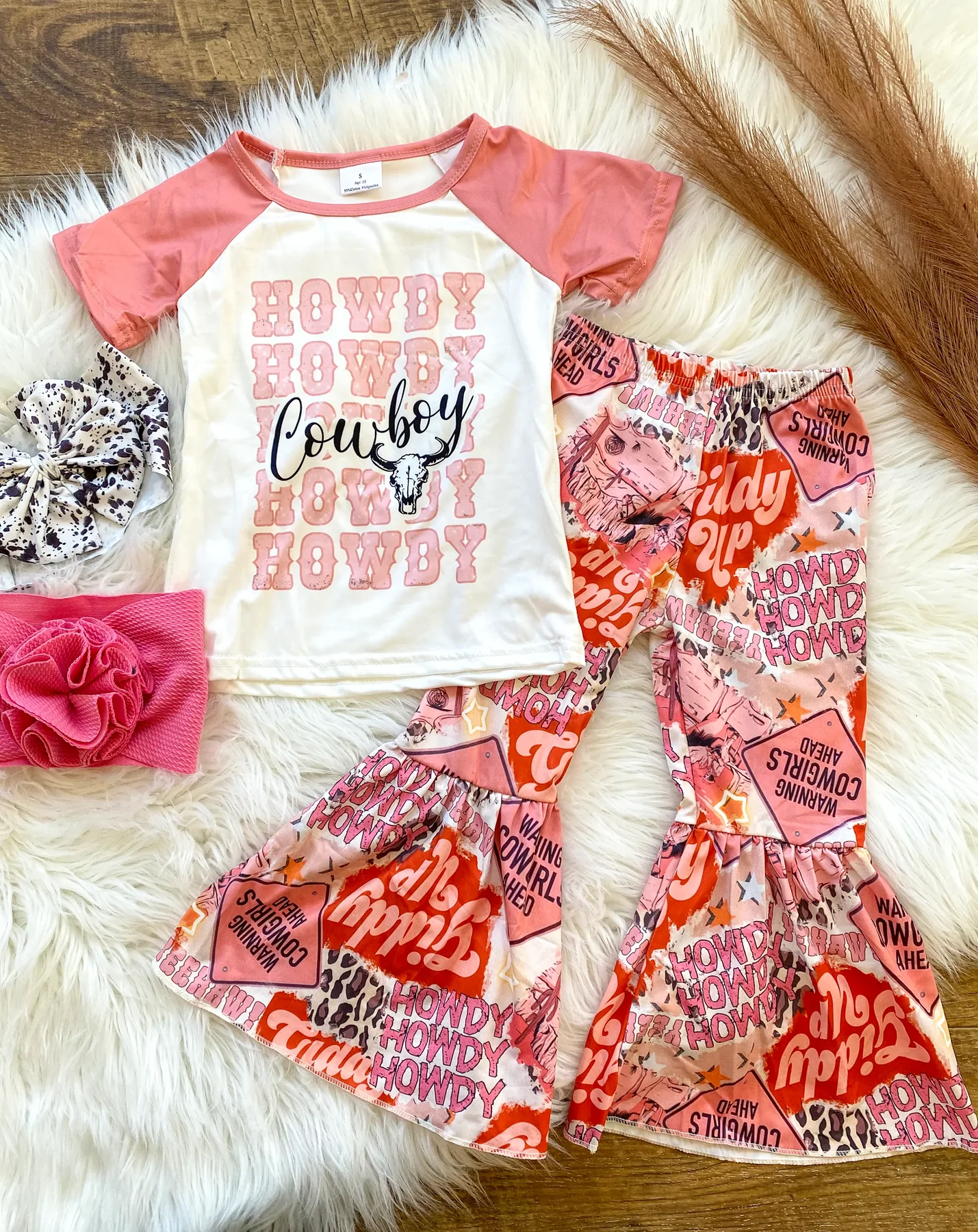 (Promotion)Cowboy howdy print short sleeve bell bottom pants western outfits E13-18