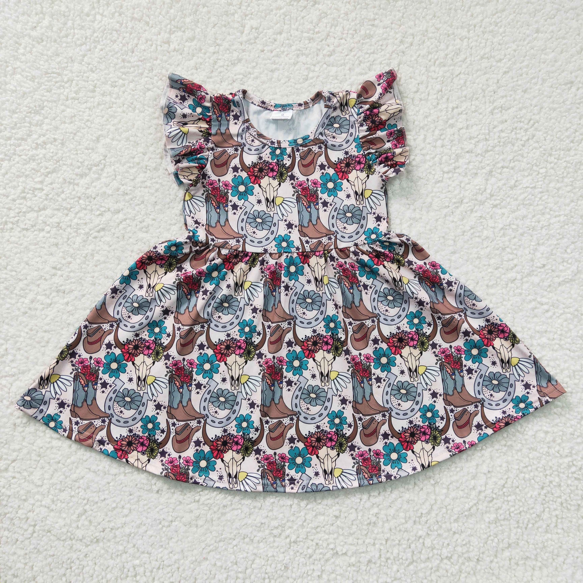 (Promotion)Girls cow skull flowers western print dress GSD0165