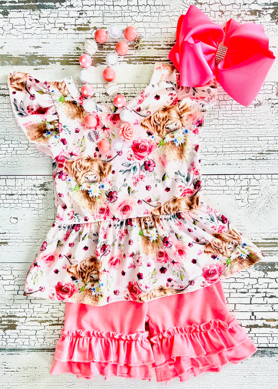 (Promotion)Girls highland cow floral print summer outfits GSSO0133