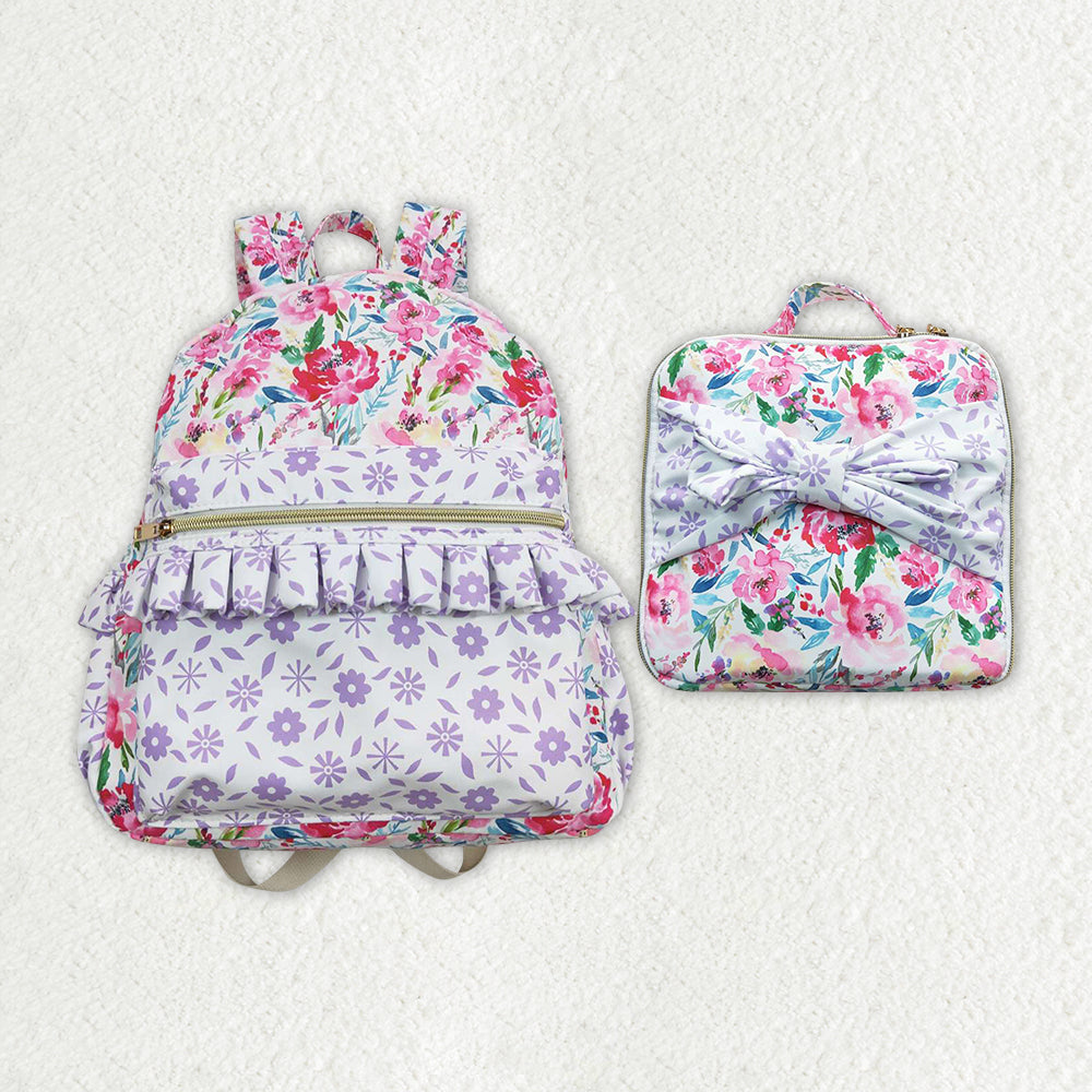 Purple Flowers Print Backpack Lunch Boxes Girls Back to School Bags