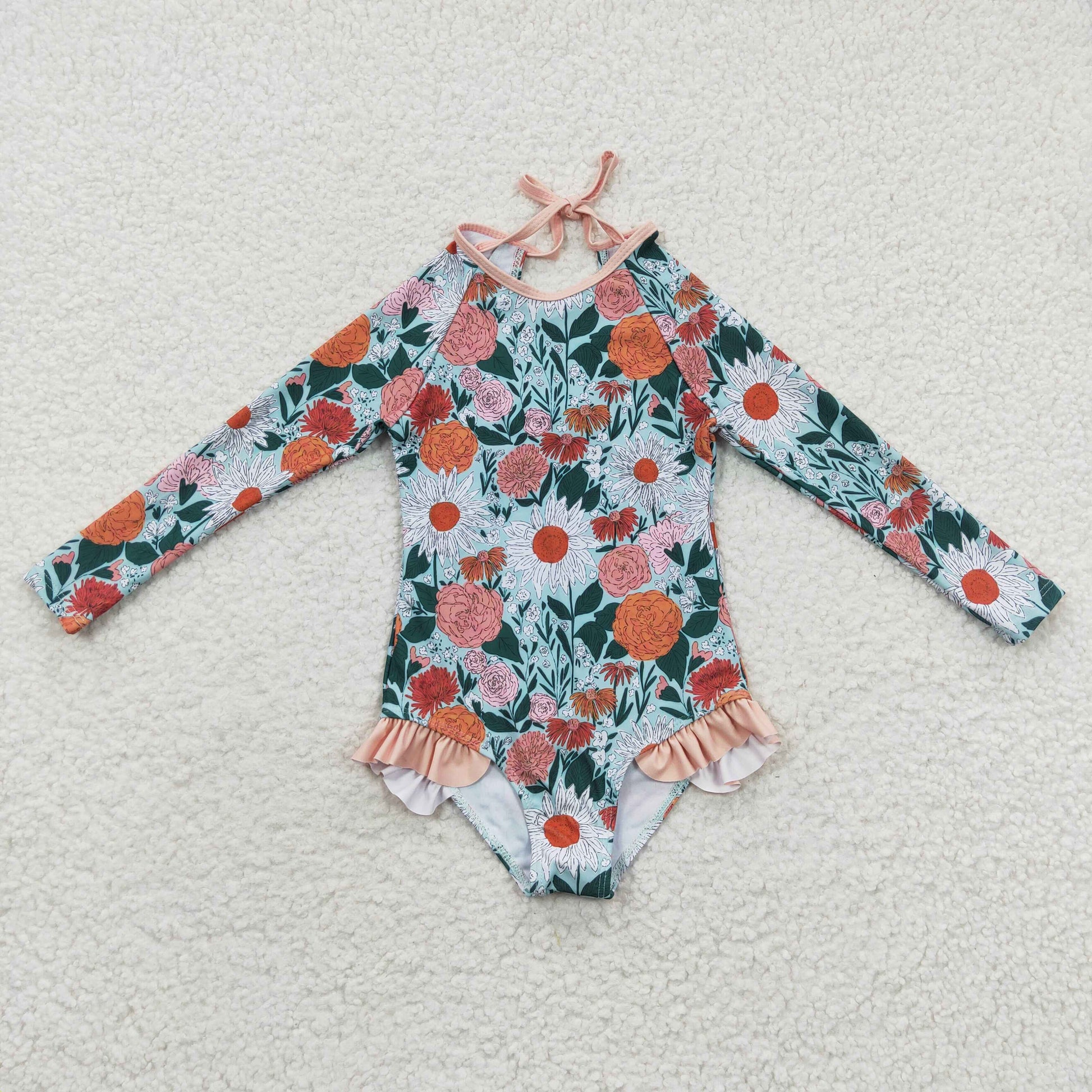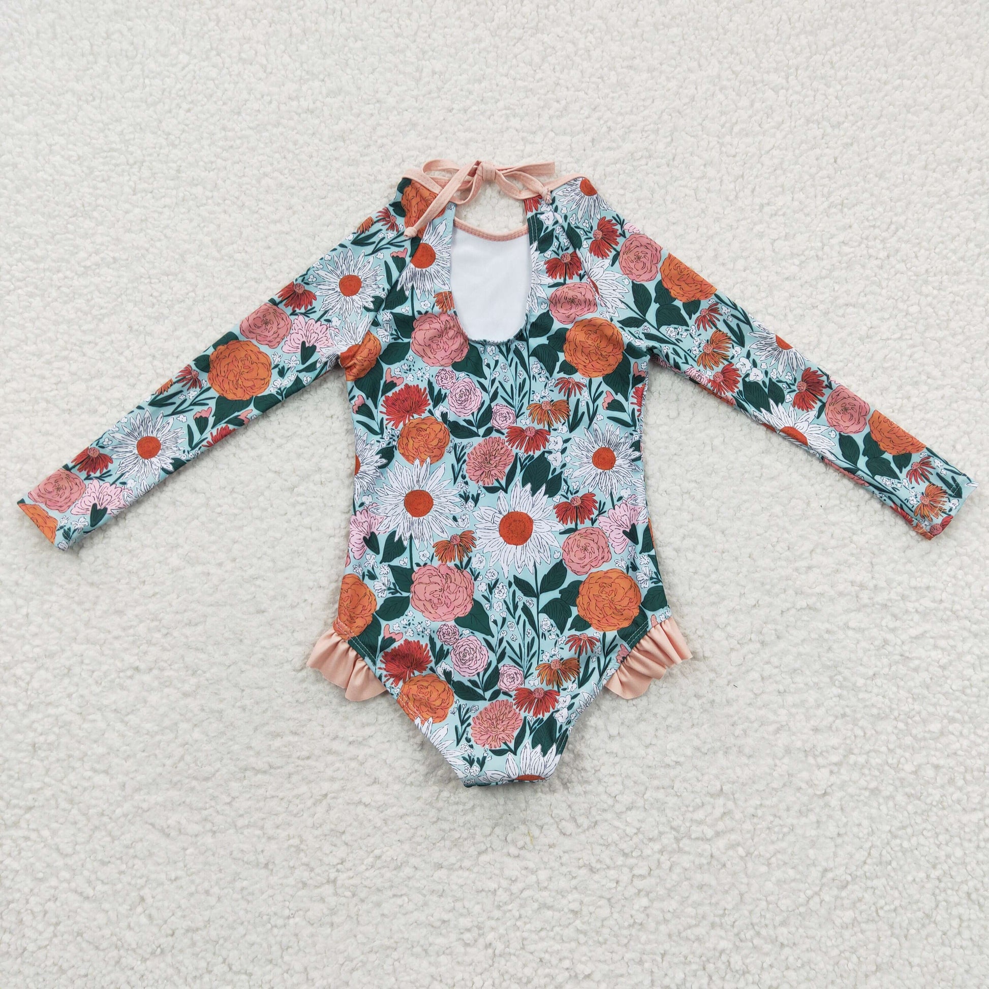 S0084 Girls long sleeve orange floral print 1 piece swimsuits