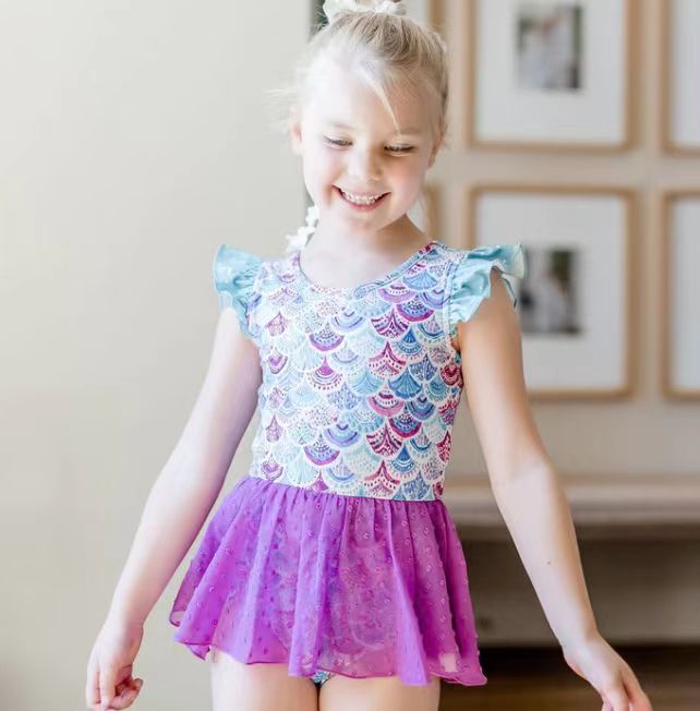S0154 Girls Mermaid Scale Print 1 Piece Purple Tulle Swimsuits
