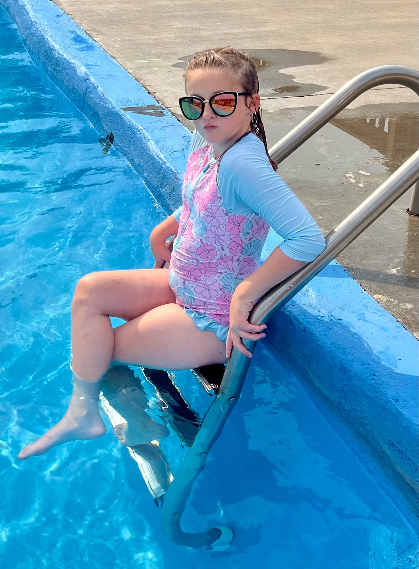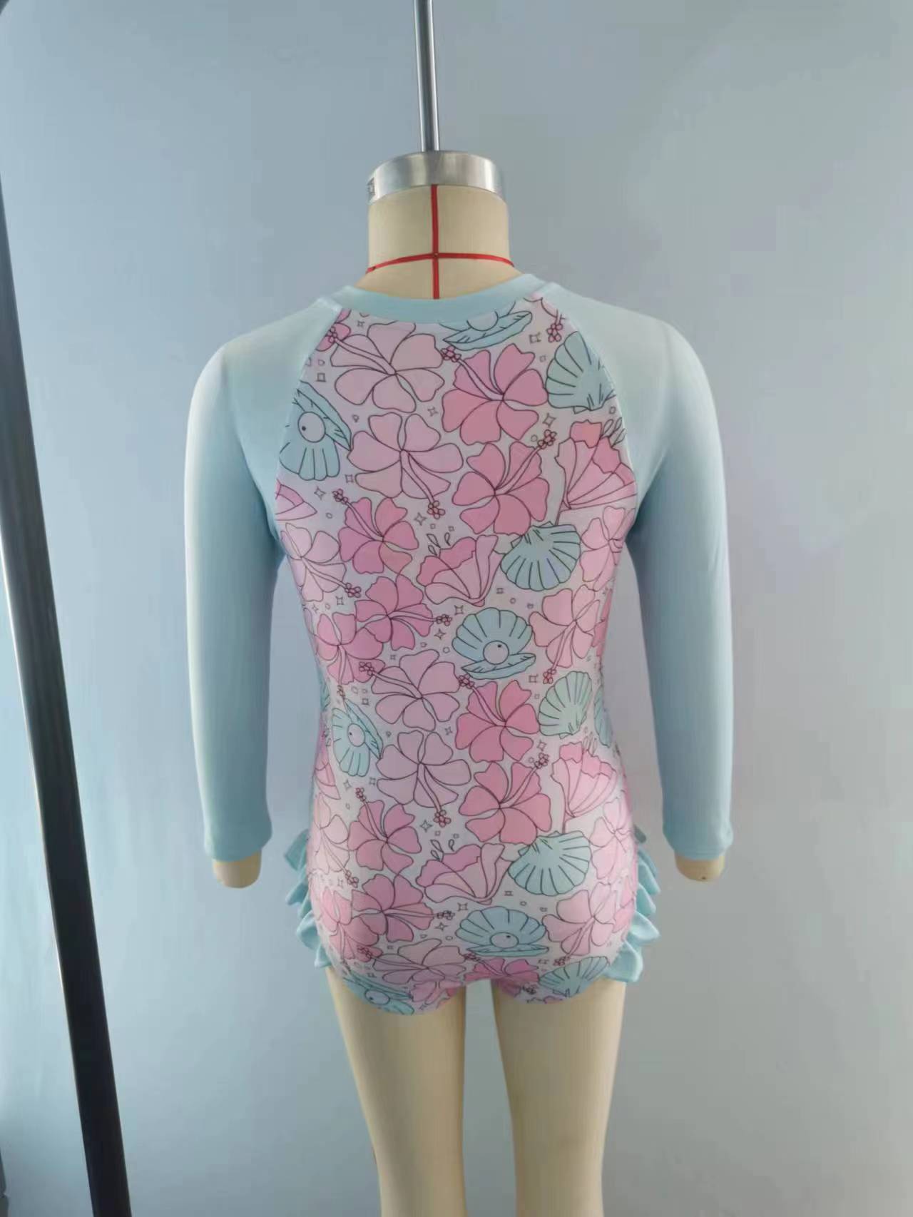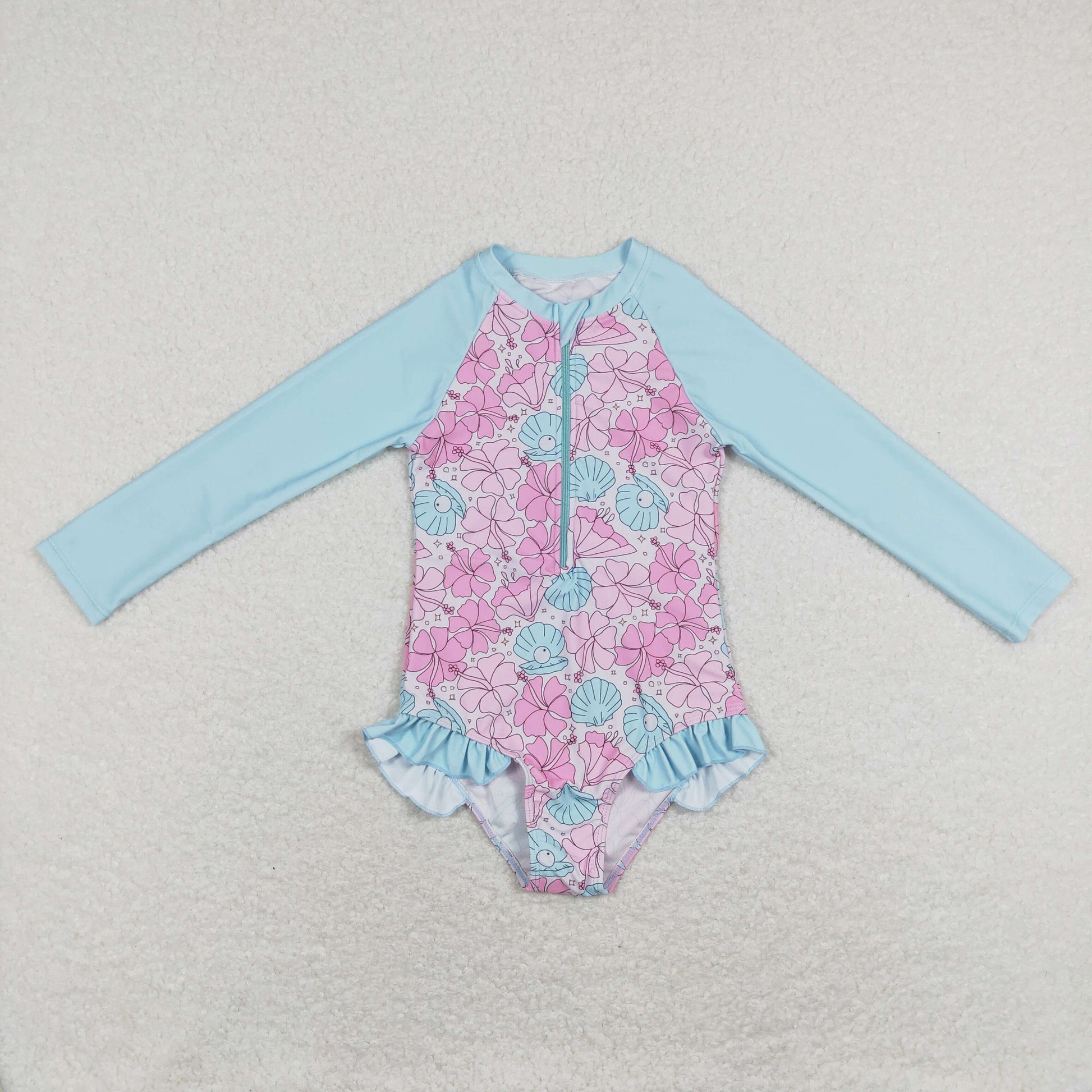 S0182 Girls Pink Flowers Blue Conch Print Long Sleeve Zipper 1 Piece Swimsuits