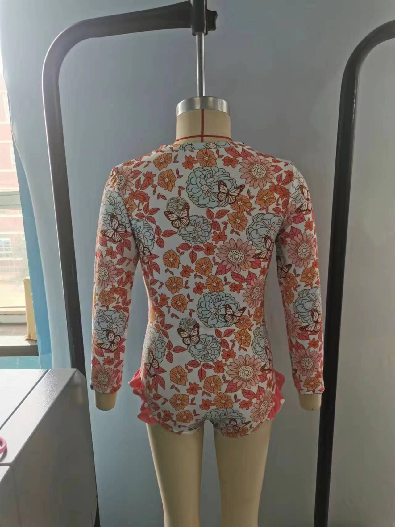 S0184 Girls Long Sleeve Flowers Print 1 Piece Zipper Swimsuits