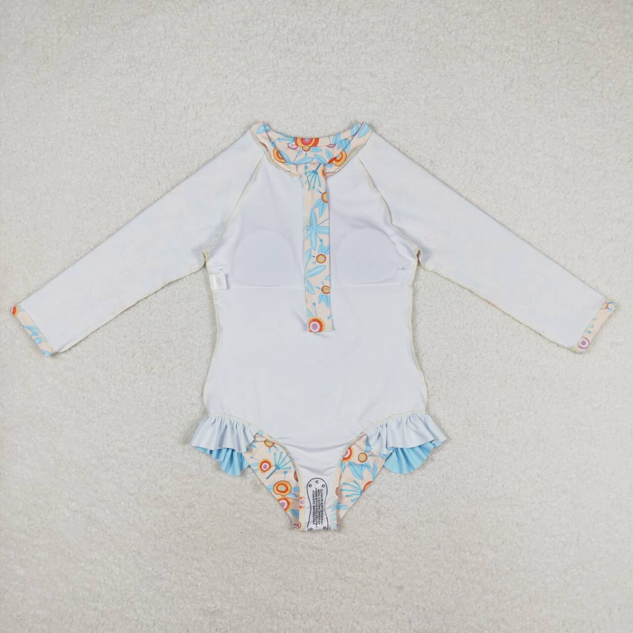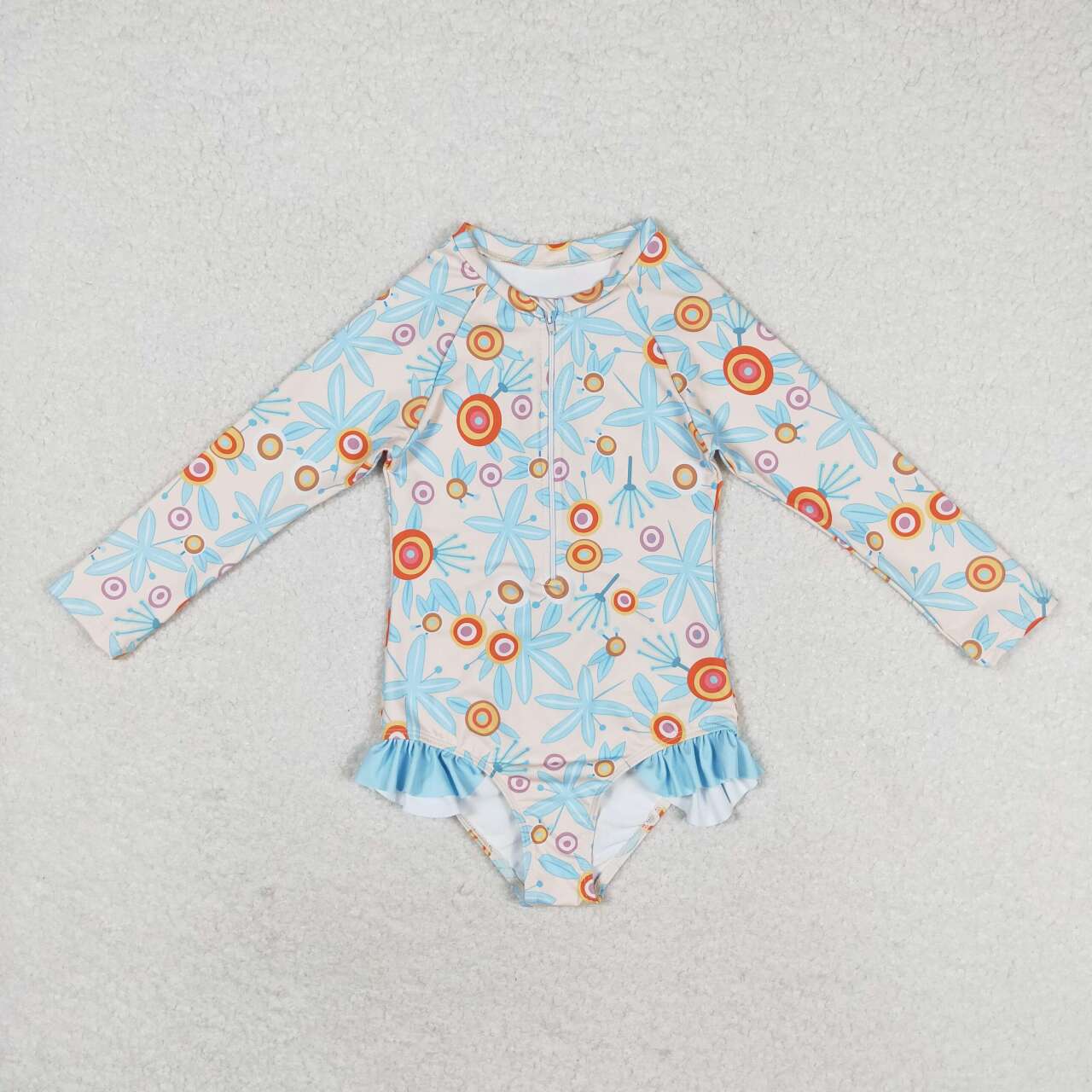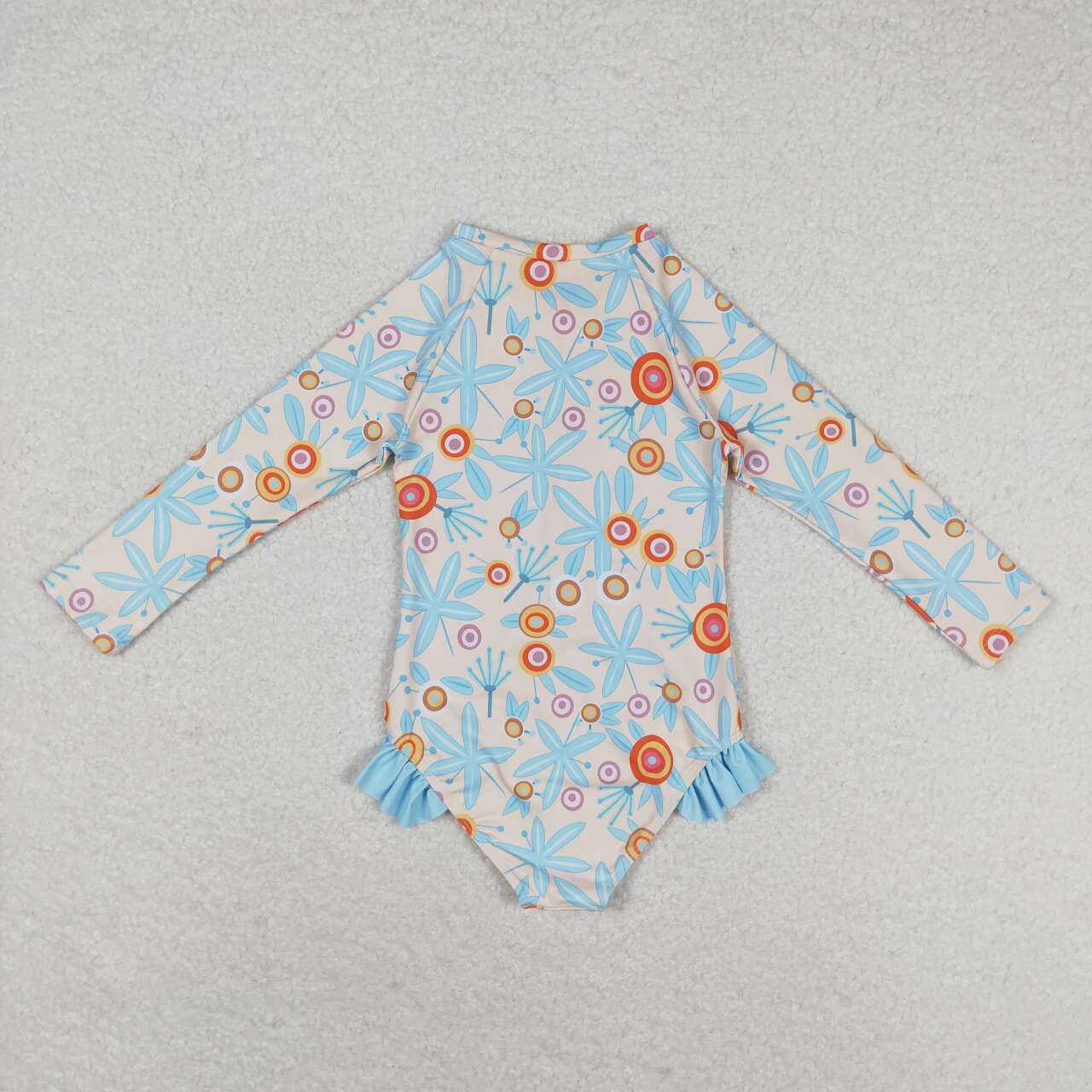 S0242 Flowers Print Girls 1 Piece Long Sleeve Zipper Swimsuits