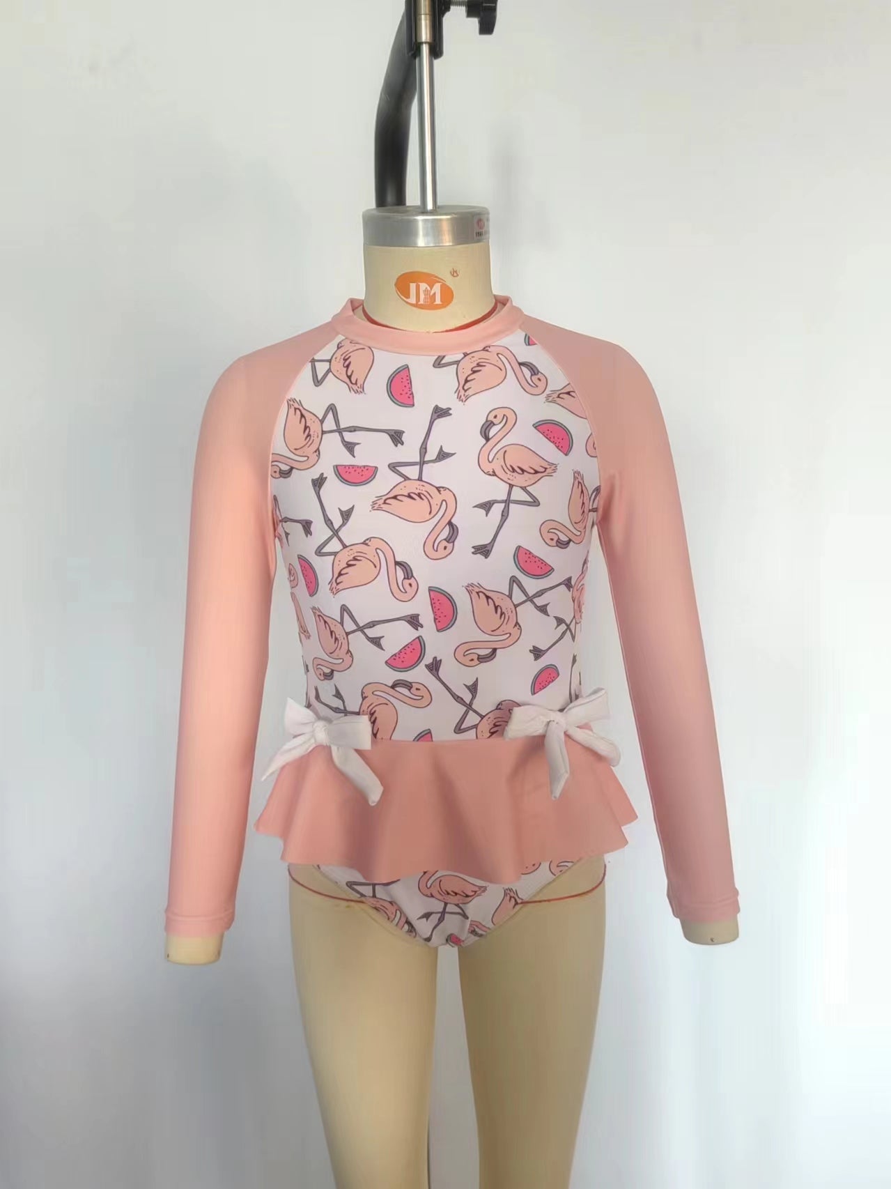 S0245 Flamingo Print Girls 1 Piece Long Sleeve Zipper Swimsuits