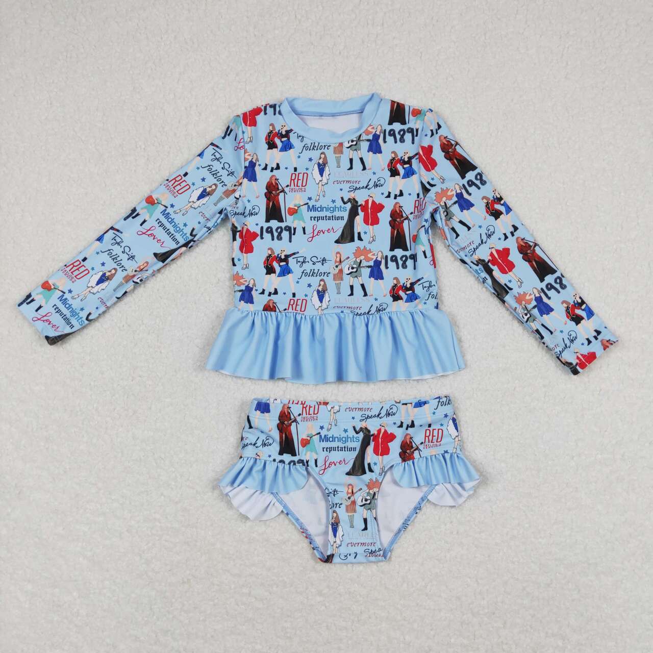 S0295 Blue Singer Swiftie Print Girls 2 Pieces Long Sleeve Swimsuits