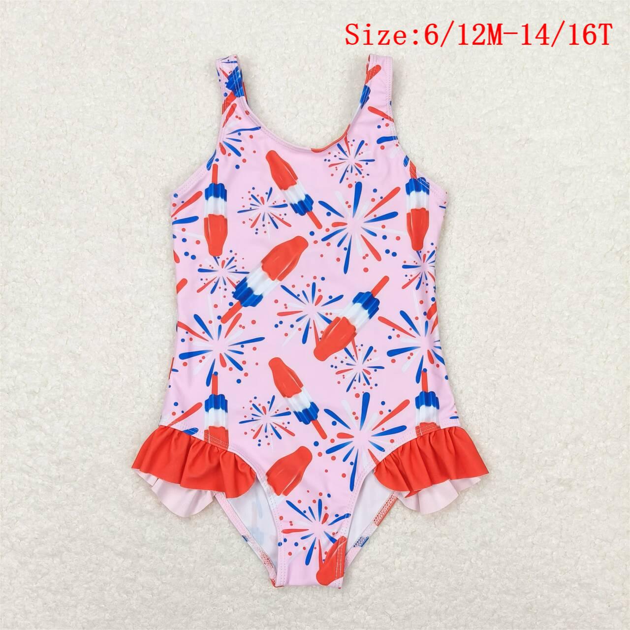 S0333 Fireworks Popsicle Pink Print Girls 1 Piece 4th of July Swimsuits
