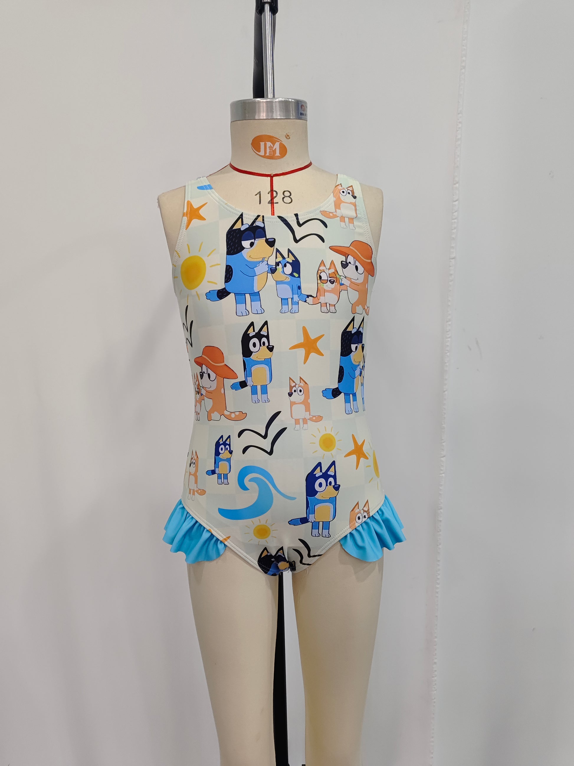 S0356 Cartoon Dog Sandbeach Print Girls 1 Piece Swimsuits
