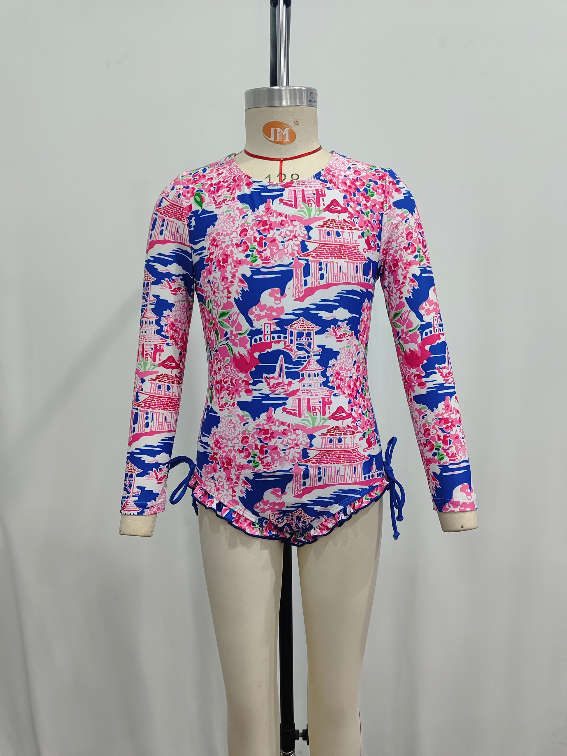 S0376 Flowers Print Girls 1 Piece Long Sleeve Zipper Swimsuits