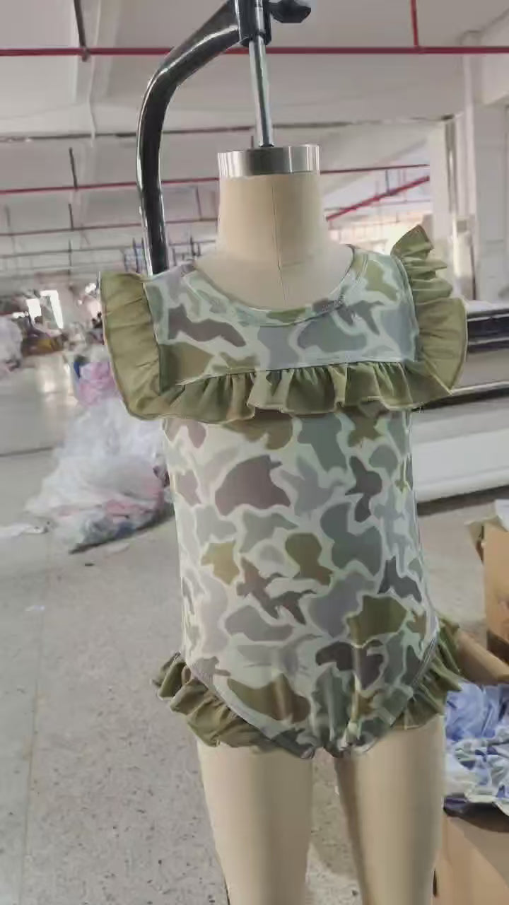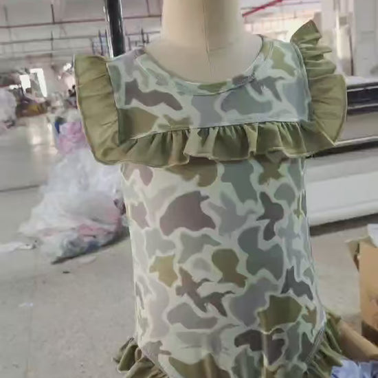 S0596 Duck Green Camo Print Girls Summer Ruffle 1 Piece Swimsuits