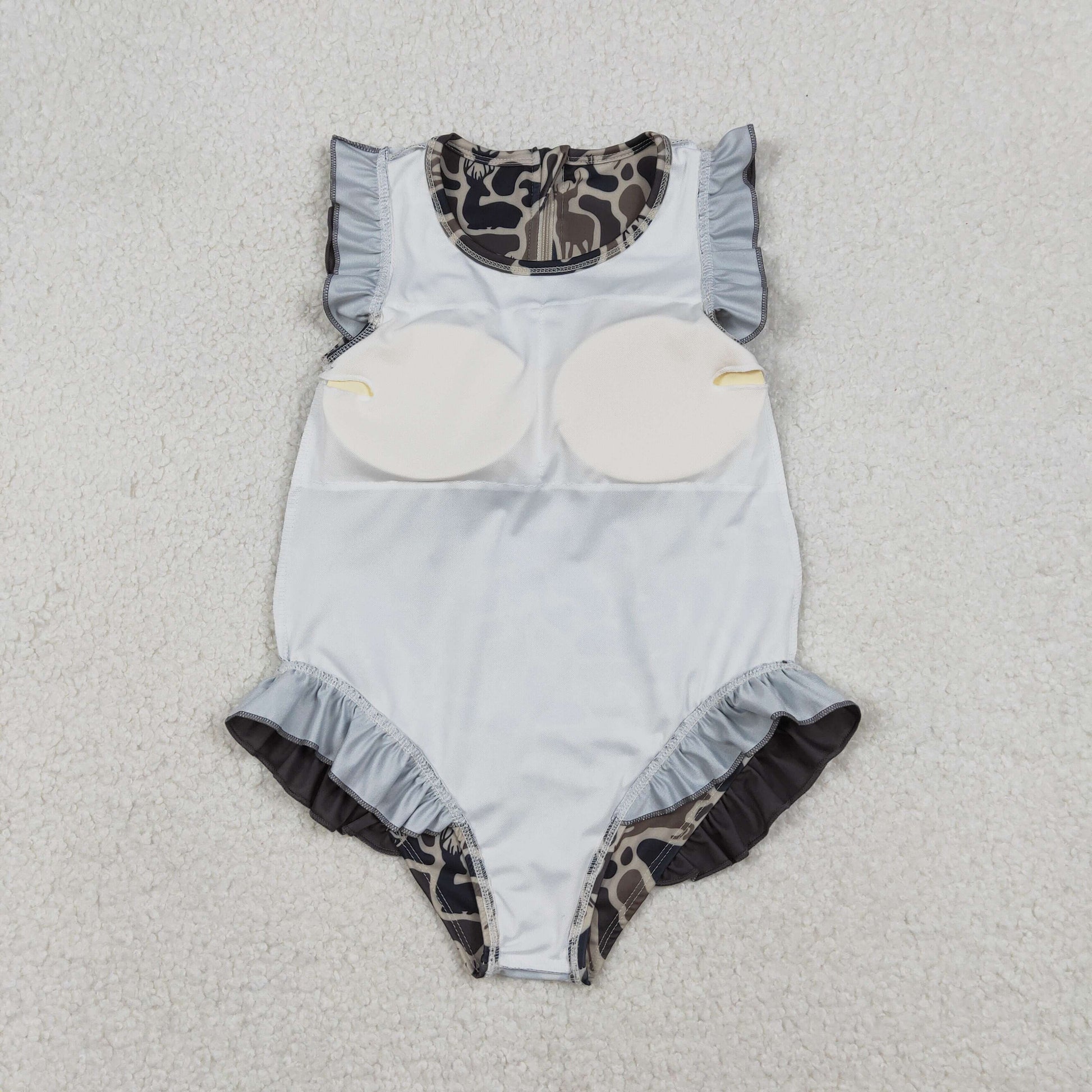 S0597 Deer Dark Brown Camo Print Girls Summer Ruffle 1 Piece Zipper Swimsuits