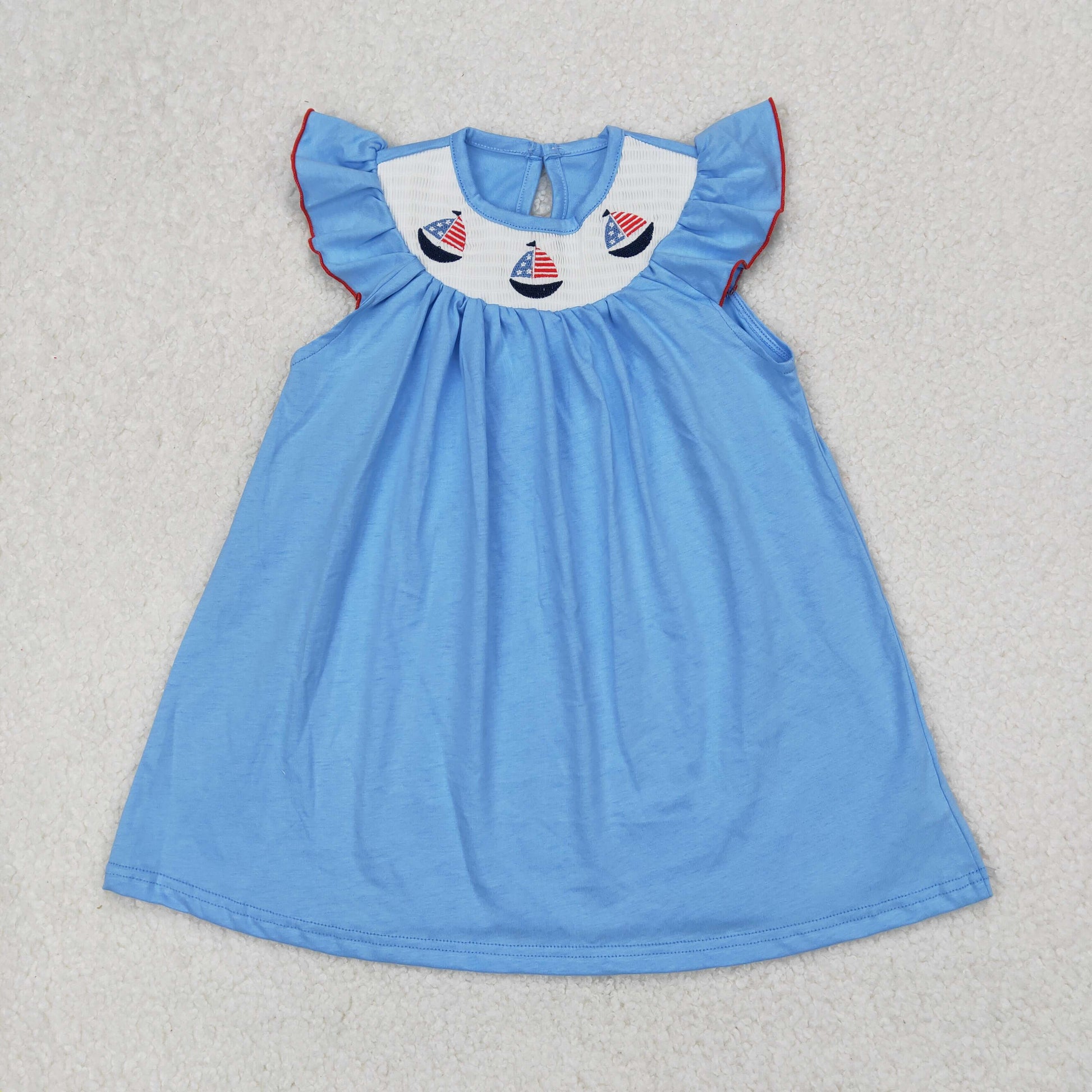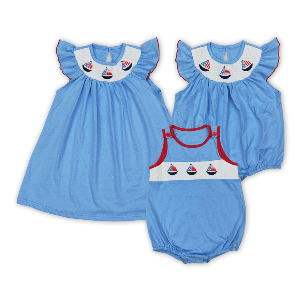 Sailboat Flag Embroidery Blue Color Sibling 4th of July Smocked Matching Clothes