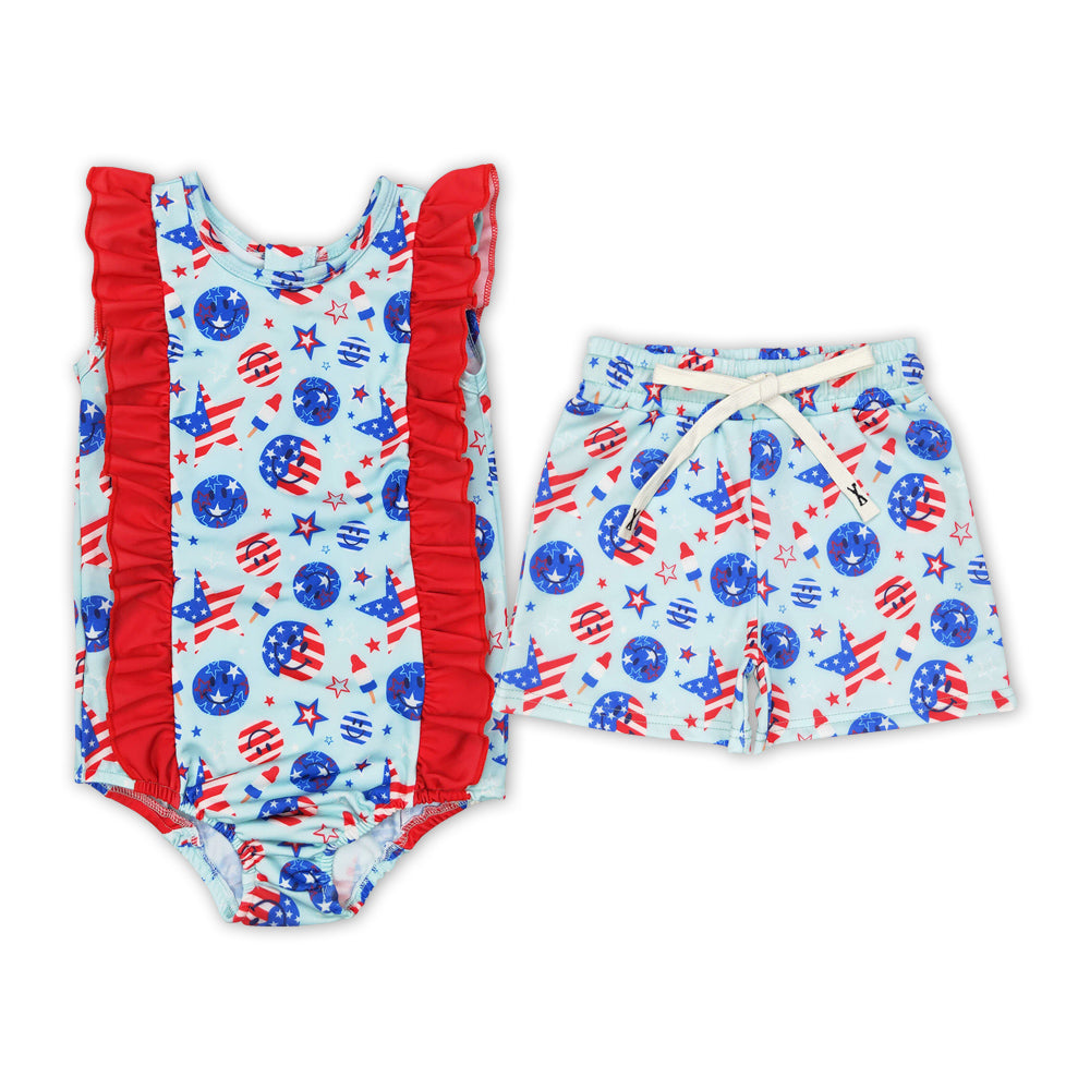 Smiling Face Stars Popsicle Print Sibling Matching 4th of July Swimsuits
