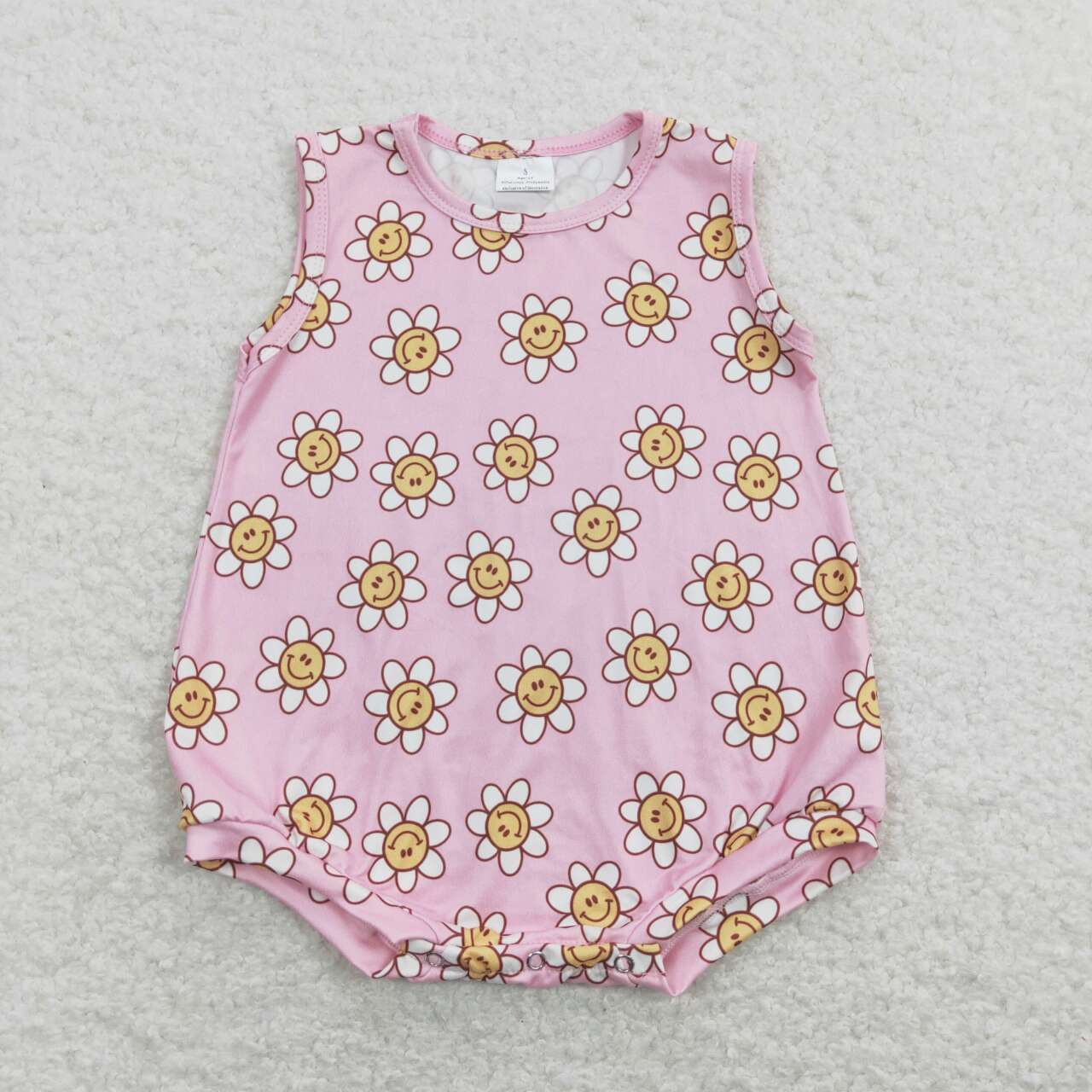 SR0574 Pink Flowers Smiling Face Print Baby Girls Summer Romper