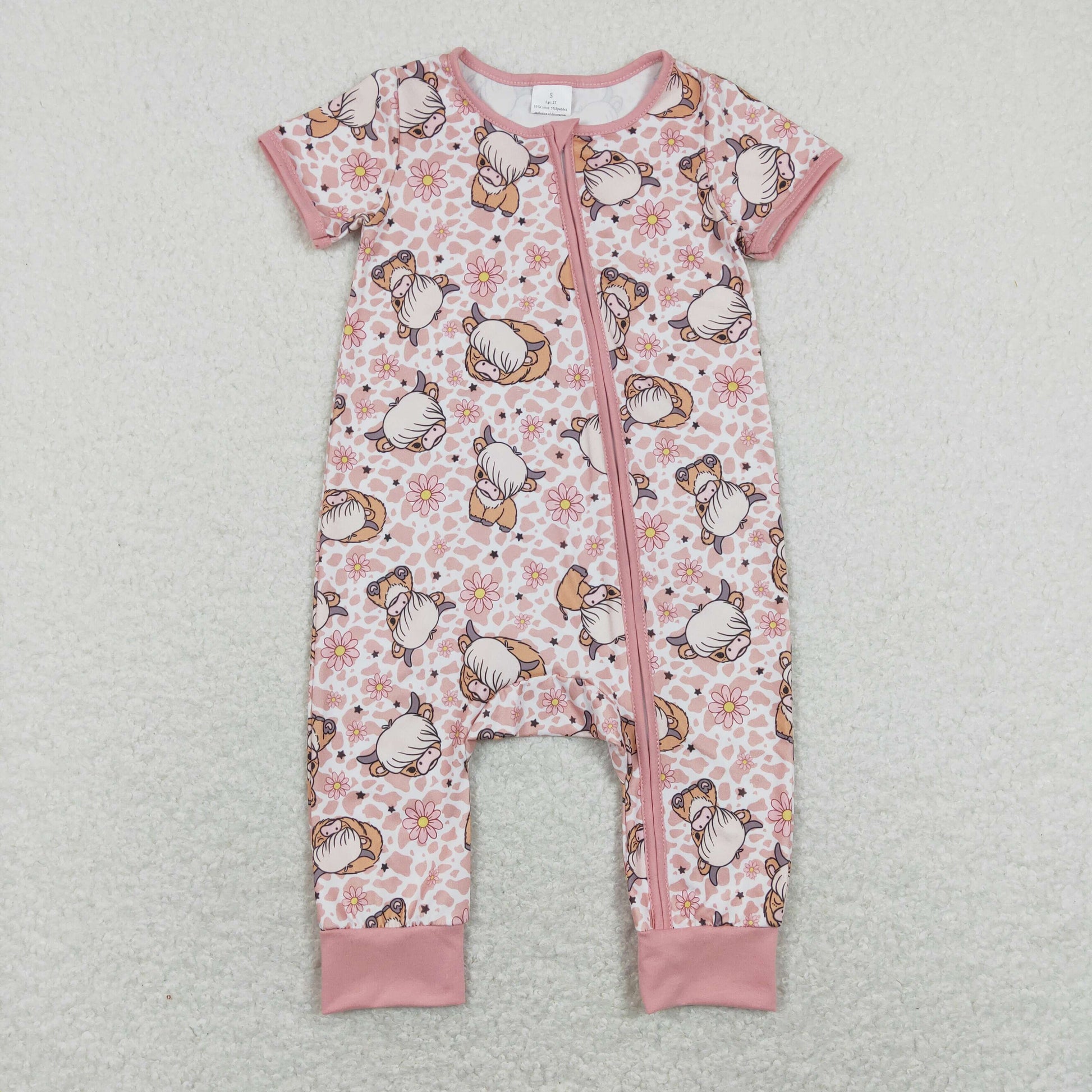 SR0924 Pink Flowers Highland Cow Print Baby Girls Zipper Romper