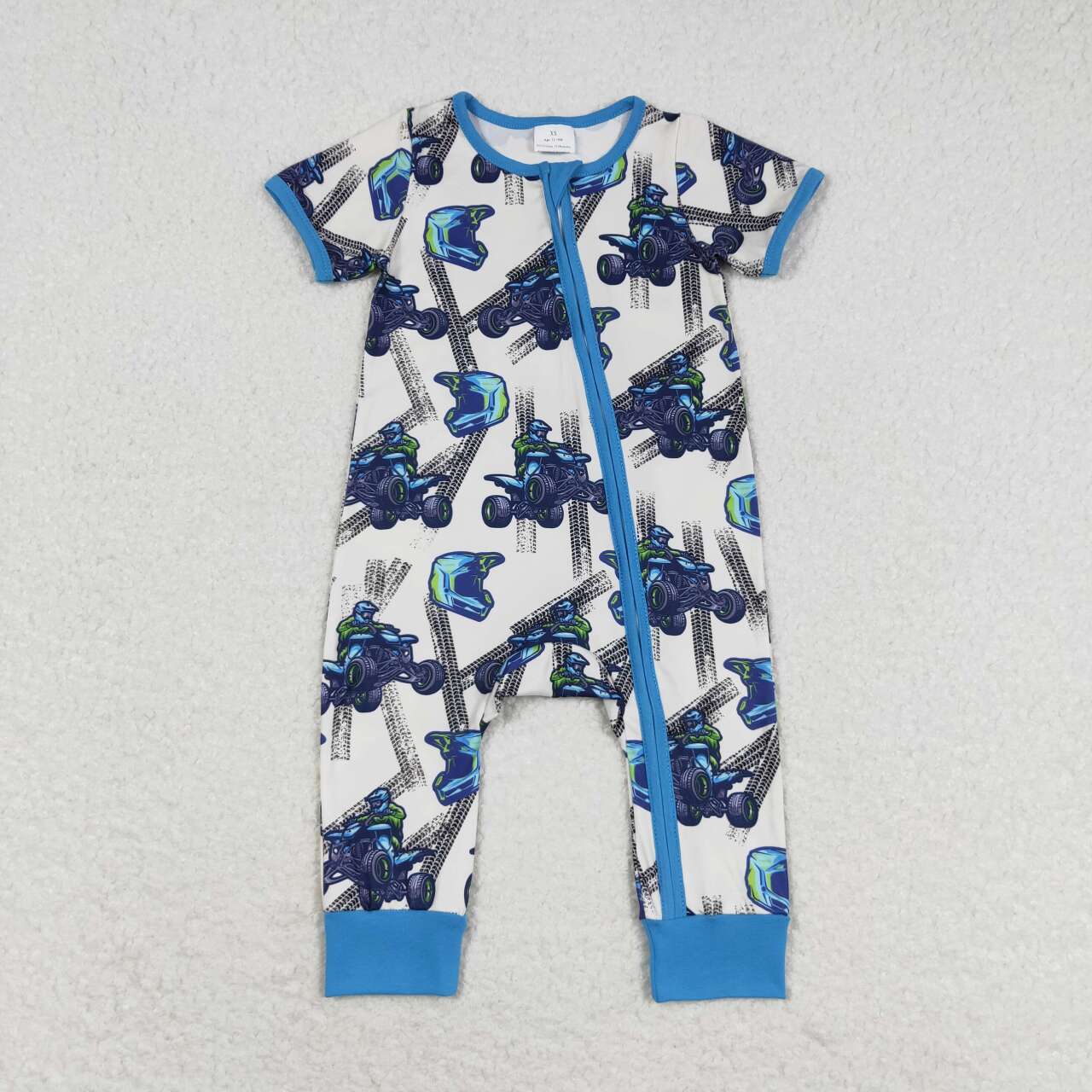 SR1379 Monster Bike Print Baby Boys Summer Zipper Romper